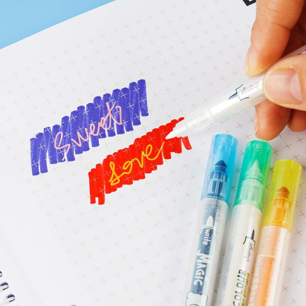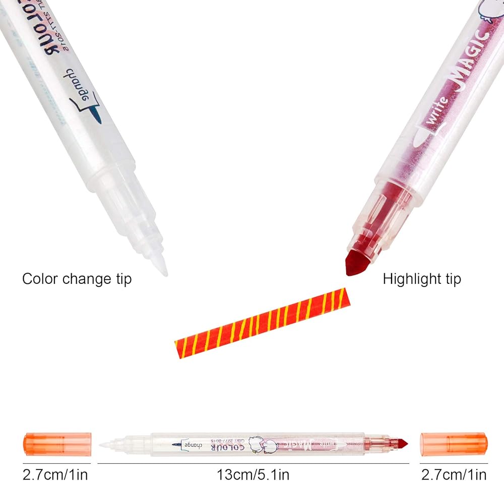 🎨【12 Assorted Colors】12 VIBRANT UNIQUE COLORS + 12 COLORLESS CHANGER. The highly pigmented magic markers are built to last against fading and magically changed beautifully for added dimension to your artwork. Soft and bright shades are both included in the magic marker set so that you can enjoy creating depth and dimension. Neon fluorescent colors absorb and reflect more light than conventional colors. Won't smear when highlighting over pencil or ink. Will deliver a long-lasting ink supply.