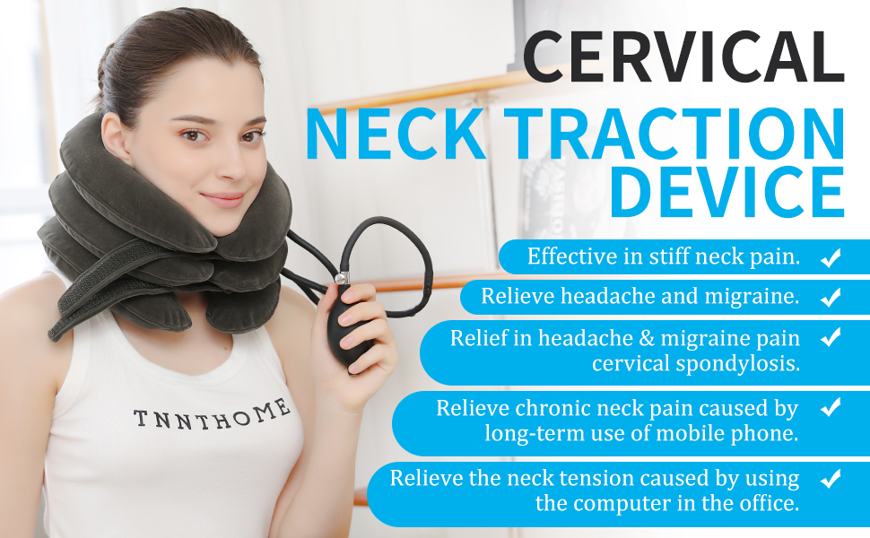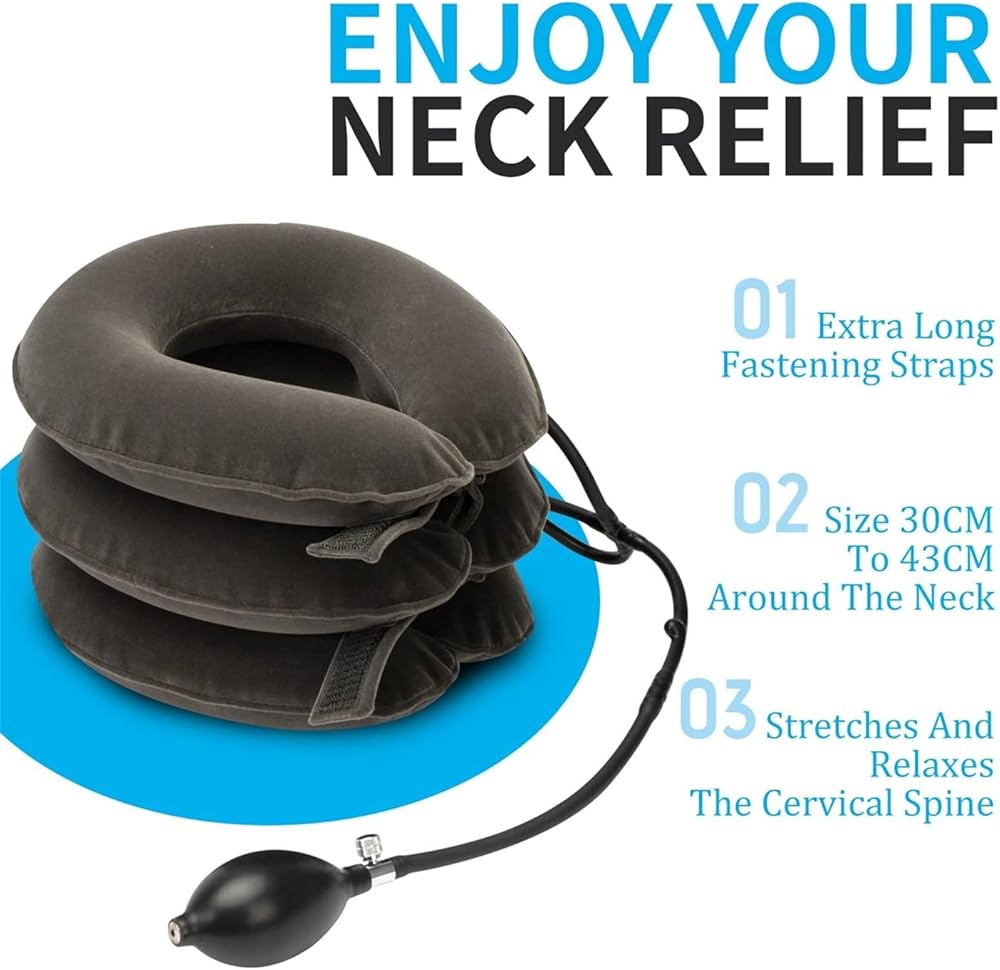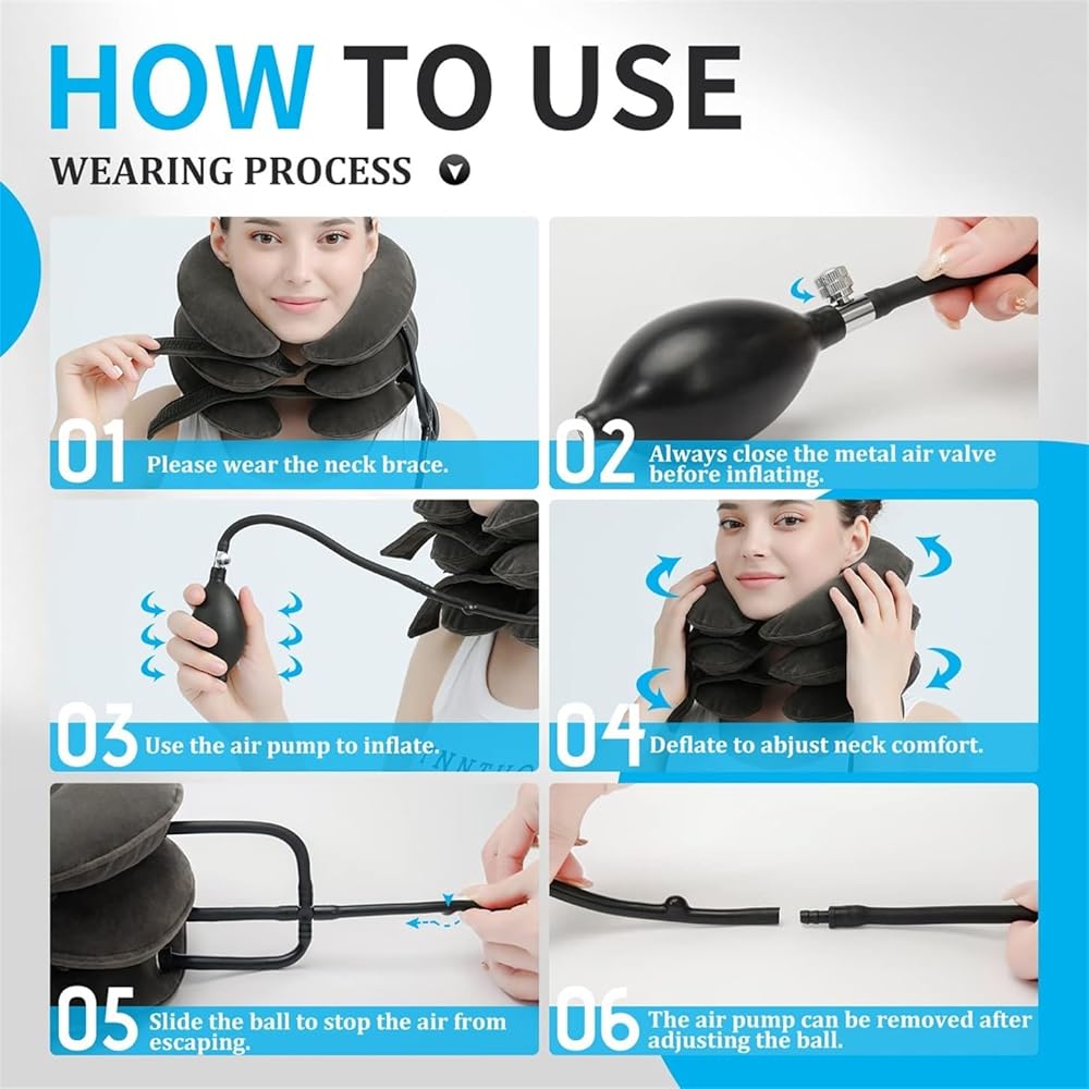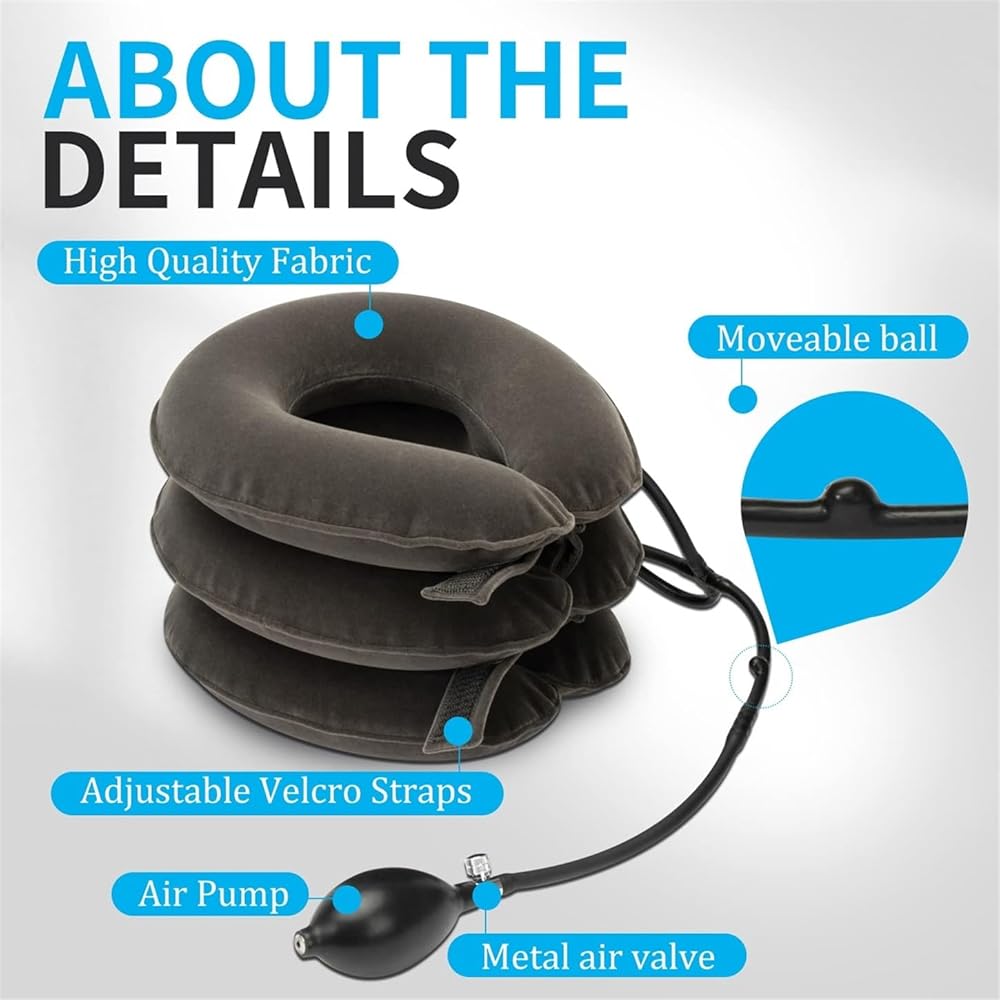 + جهاز تخفيف ضغط الرقبة القابل للتعديل - يمكنك اختيار زاوية الجر التي تناسب احتياجاتك بشكل أفضل من خلال التحكم في مقدار النفخ. يسمح لك الفيلكرو بضبط إحكام جهاز الجر الملتف حول رقبتك لضمان عدم شعورك بالاختناق. تساعدك مضخة الهواء الأكبر وصمام النزيف المعدني على ضبط الوحدة بسرعة. يمكن لرقبتك وأكتافك الاستمتاع براحة الجهاز من التعب دون عناء.