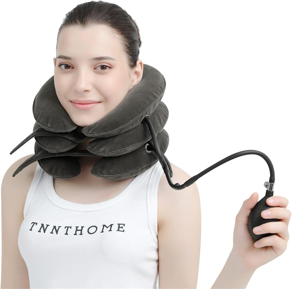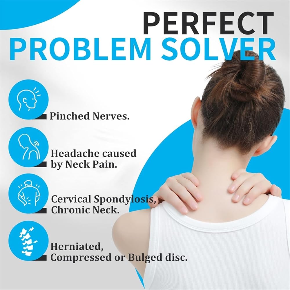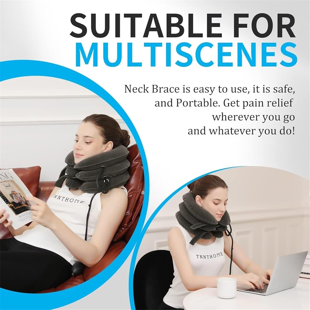 + جهاز تخفيف ضغط الرقبة القابل للتعديل - يمكنك اختيار زاوية الجر التي تناسب احتياجاتك بشكل أفضل من خلال التحكم في مقدار النفخ. يسمح لك الفيلكرو بضبط إحكام جهاز الجر الملتف حول رقبتك لضمان عدم شعورك بالاختناق. تساعدك مضخة الهواء الأكبر وصمام النزيف المعدني على ضبط الوحدة بسرعة. يمكن لرقبتك وأكتافك الاستمتاع براحة الجهاز من التعب دون عناء.