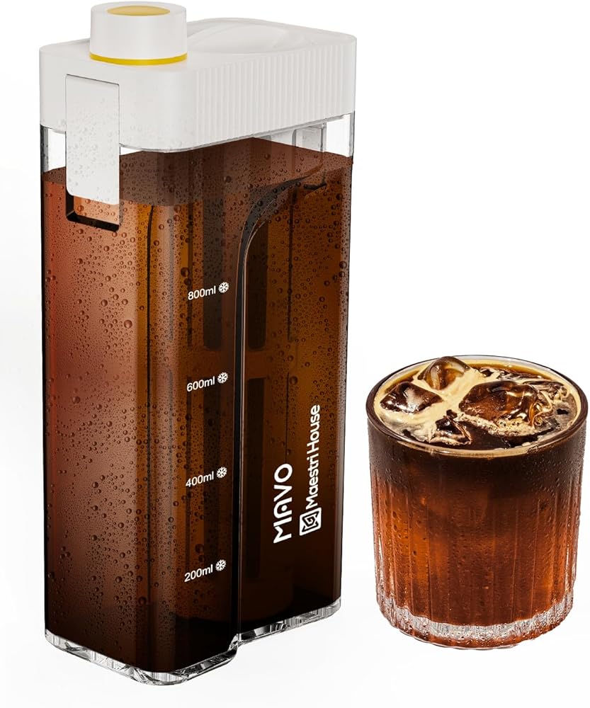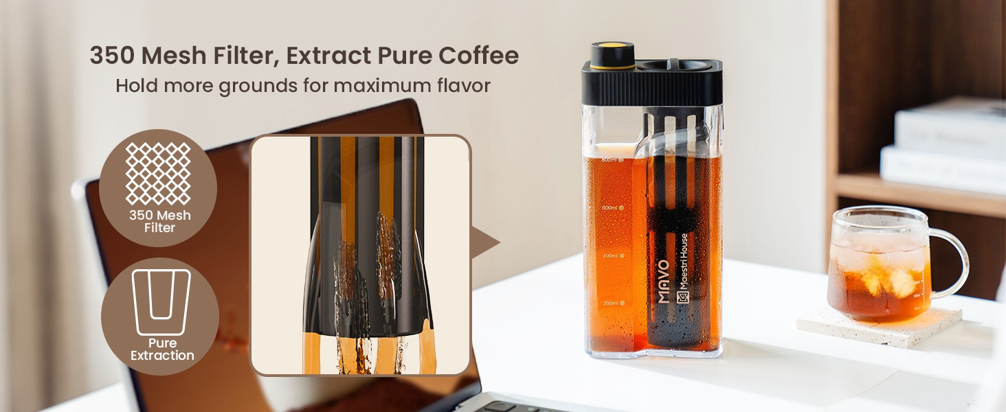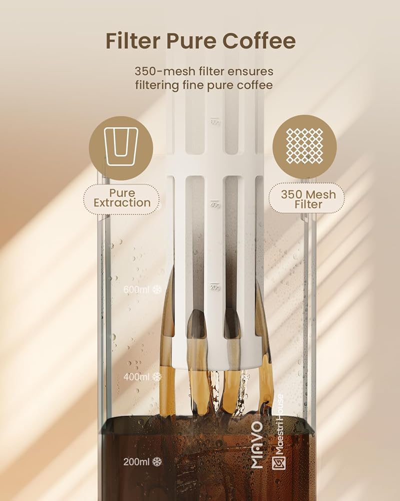 • [تذوق القهوة الباردة بجودة باريستا] باستخدام ماكينة صنع القهوة الباردة من مايستري هاوس، يمكنك بسهولة صنع قهوة باردة بجودة باريستا. اصنع ما يصل إلى 6 أكواب من مشروب بارد مركز وغني وناعم ومنعش والذي يكون طبيعيًا أقل حموضة بنسبة 65% من القهوة الساخنة التقليدية. سيعمل الفلتر فائق الدقة الفريد من نوعه المكون من 350 شبكة على زيادة استخلاص نكهة القهوة إلى الحد الأقصى، وتقليل أي رواسب أو مرارة، وتخصيص القهوة الباردة المثالية حسب تفضيلاتك.