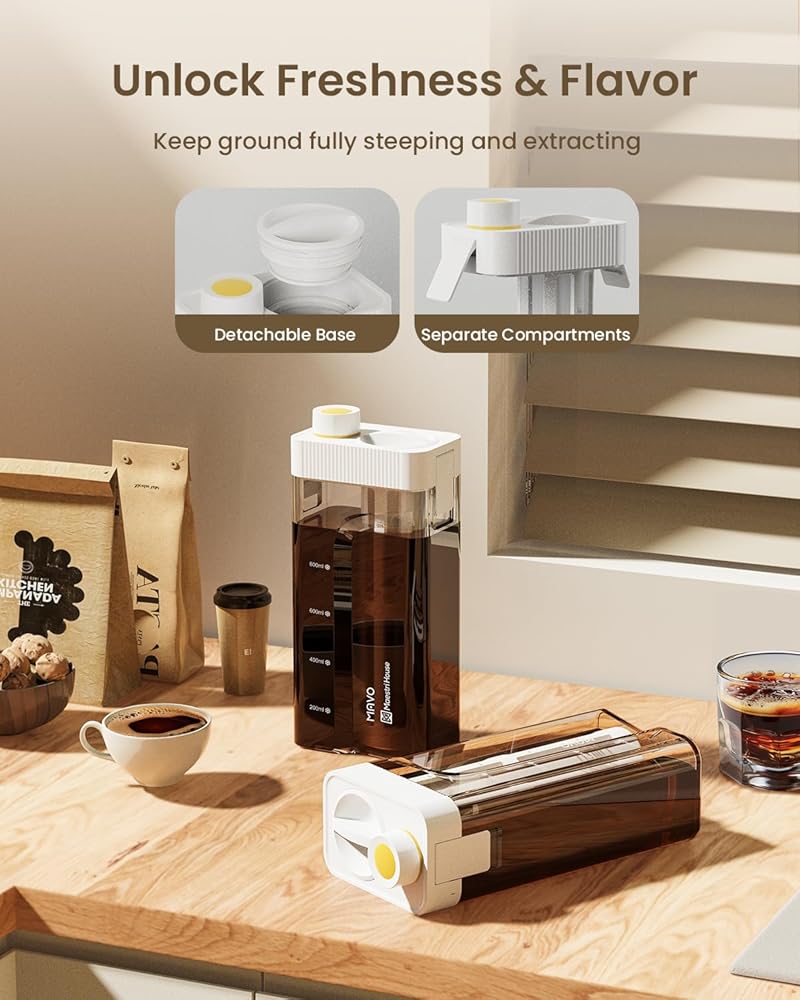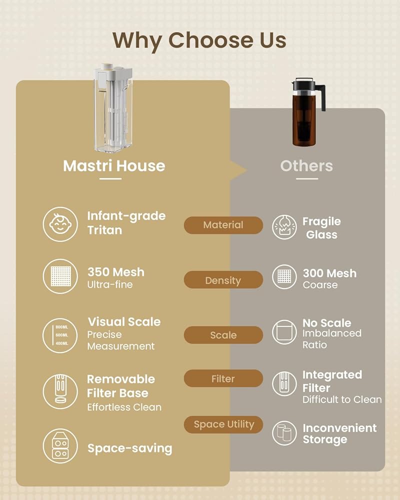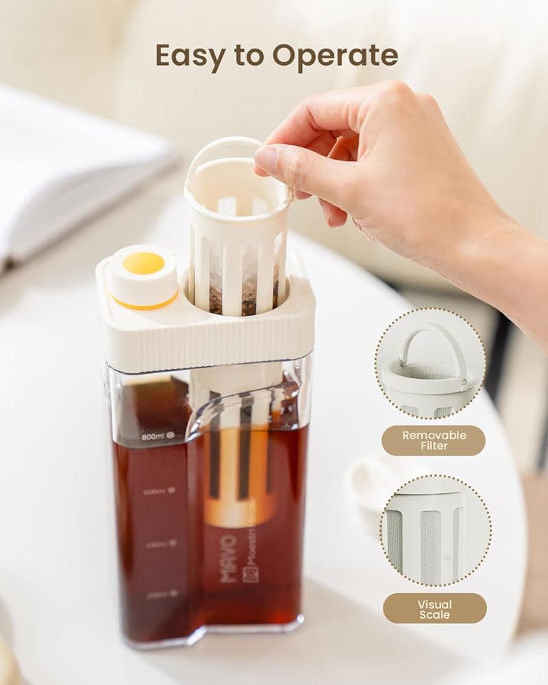 • [تصميم مريح] تم تصميم إبريق المشروبات الباردة وفلتره بمقاييس دقيقة على جسمه للحصول على نسبة دقيقة لصنع القهوة. يعد فلتر ماكينة صنع القهوة هذا المزود بغطاء سفلي قابل للإزالة أسهل في تنظيف البقايا مقارنة بفلتر الكل في واحد. تصميم المقبض المريح يجعل من السهل حمل القهوة وصبها.