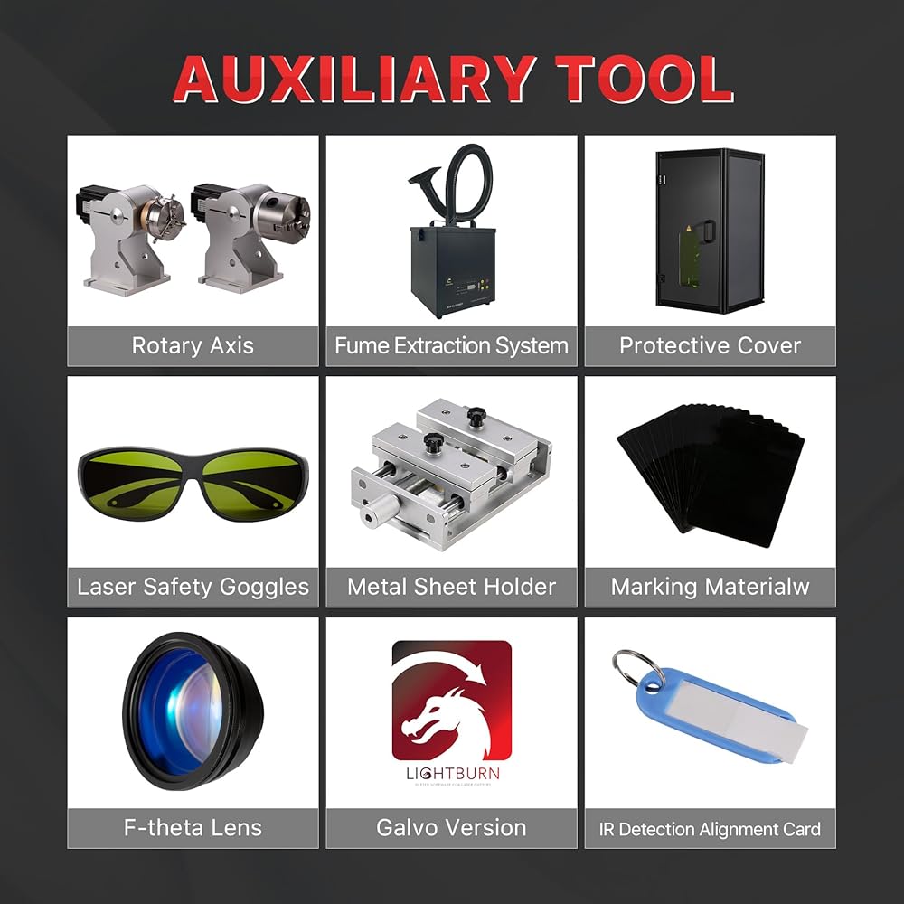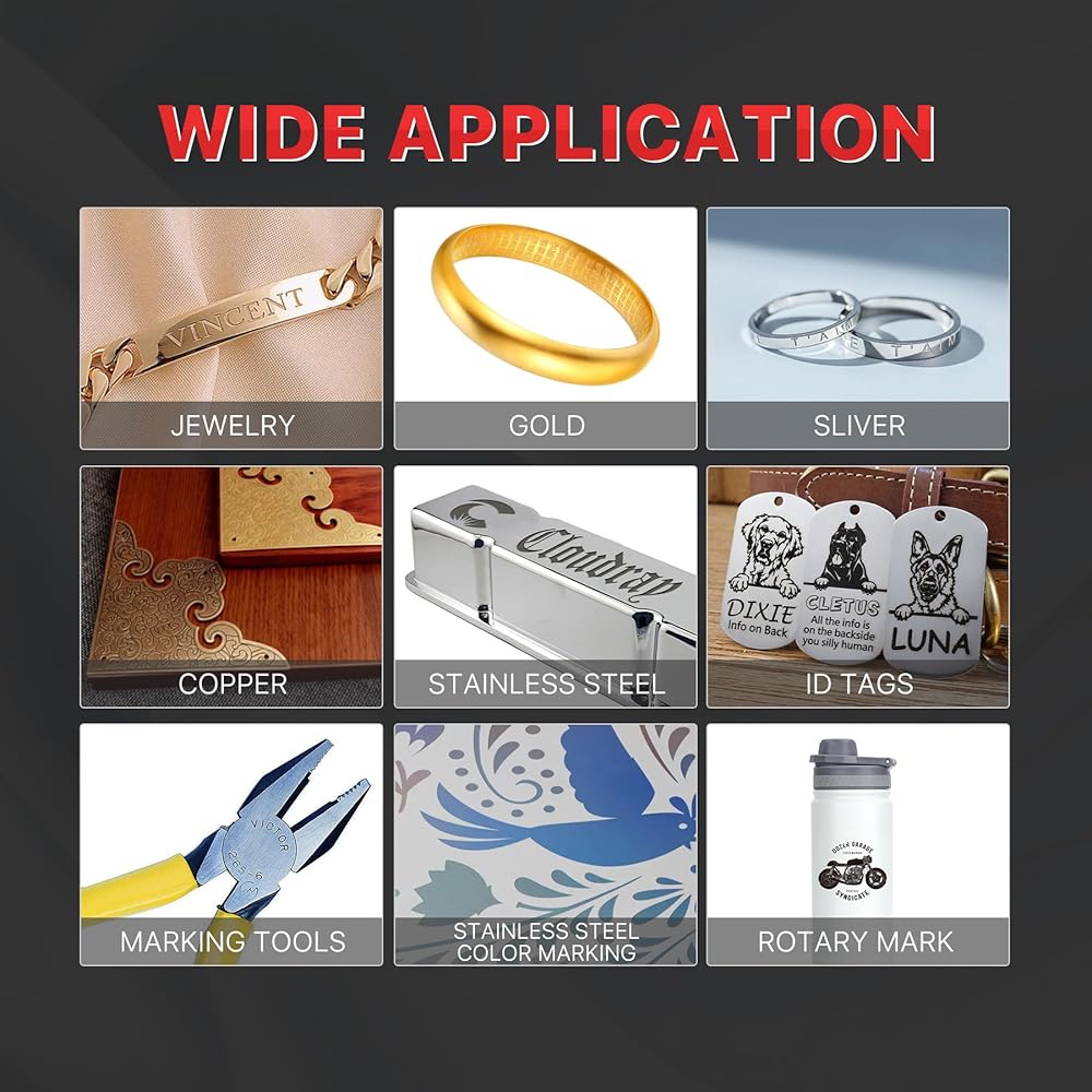 【قاطع ونقش بالليزر الآمن من الفئة 2】طاقة إخراج النقش بليزر الألياف: 30,000 ميجاوات. مع تعليمات واضحة وتصميم معياري يسمح بالتجميع السريع؛ يضمن مقياس الارتفاع الدقيق التركيز اليدوي الدقيق والخالي من الأخطاء، وسهل التكرار. تسمح المنافذ ذات 4 سنون بتوصيل التوصيل والتشغيل بمحور دوار (غير متضمن)، مما يسمح بوضع العلامات على الأسطح المنحنية مثل الحلقات والأكواب والأنابيب والأشياء الأخرى. أطلق العنان لإبداعك بلا حدود.