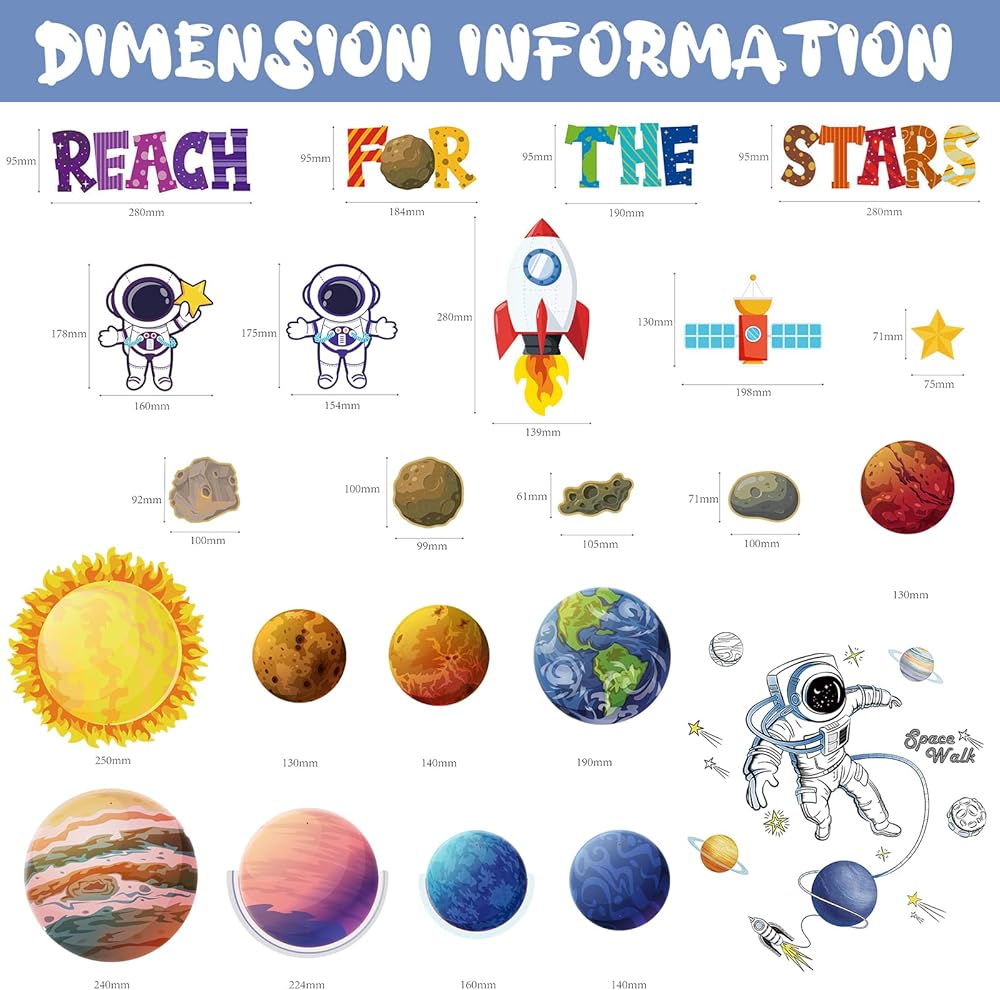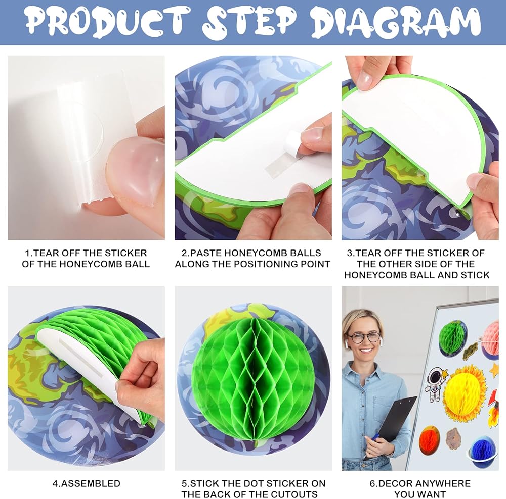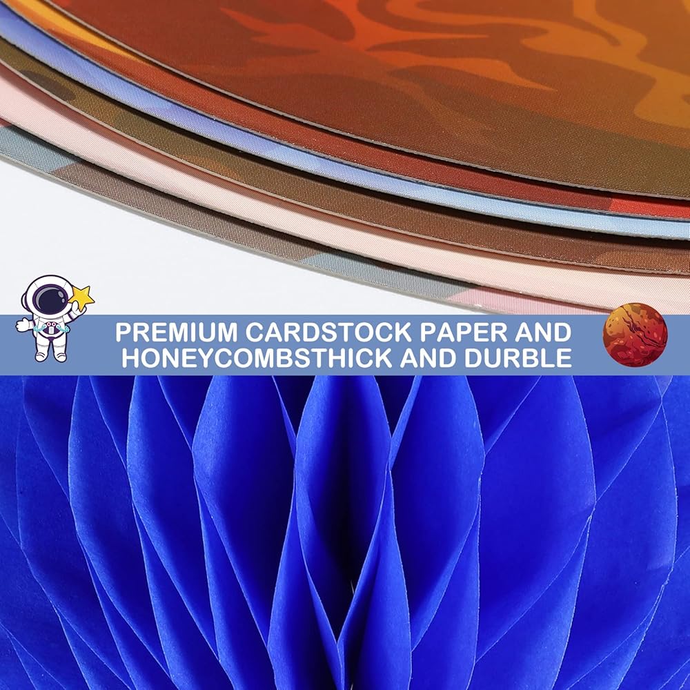 قوية وموثوقة: هذه القطع المركزية للوحة إعلانات كواكب الفضاء الخارجي مصنوعة من ورق بطاقات سميك ومتين بوزن 250 جرام، والقطع المركزية على شكل قرص العسل مصنوعة من بطاقة ورقية مزدوجة الجوانب عالية الجودة وشريط مزدوج الجوانب، مصممة بأنماط رائعة ونابضة بالحياة وألوان زاهية، ليس من السهل كسرها، يمكنك استخدامها بثقة
