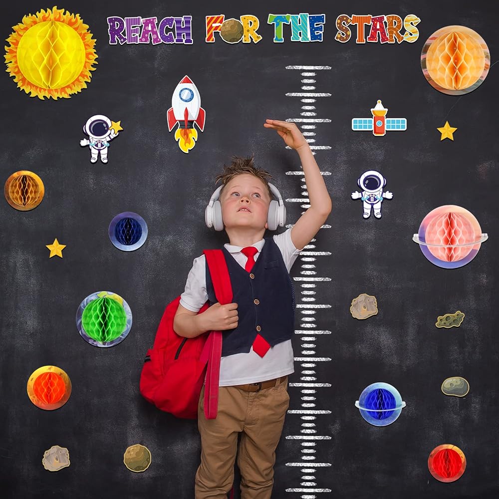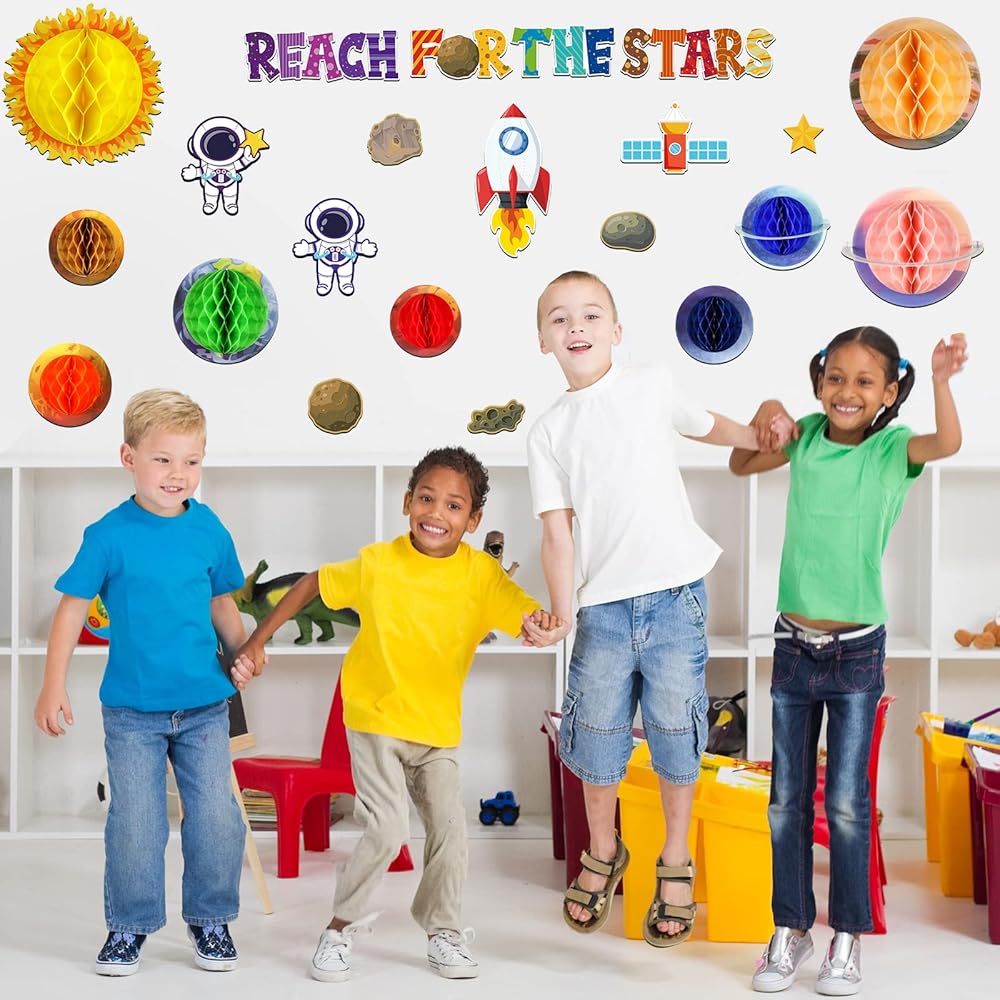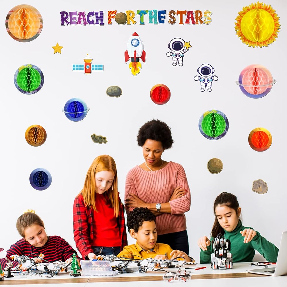 22 قطعة ثلاثية الأبعاد للفضاء الخارجي على شكل قرص العسل للفصول الدراسية مجموعة ديكورات لوحة الإعلانات للنظام الشمسي، مستلزمات ديكور المدرسة على شكل قرص العسل من المجرة، قواطع الكوكب لغرفة الأطفال، مستلزمات حفلات النظام الشمسي
