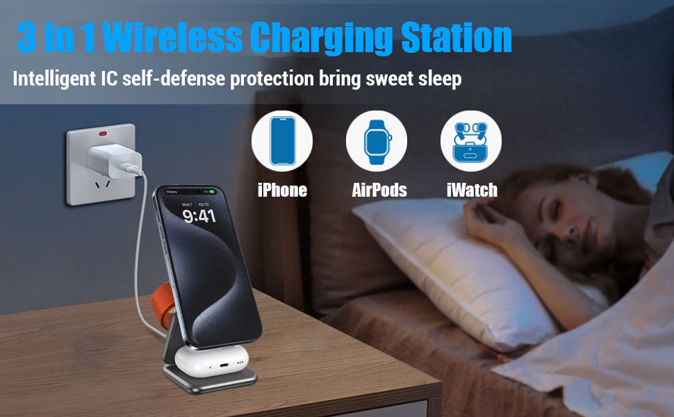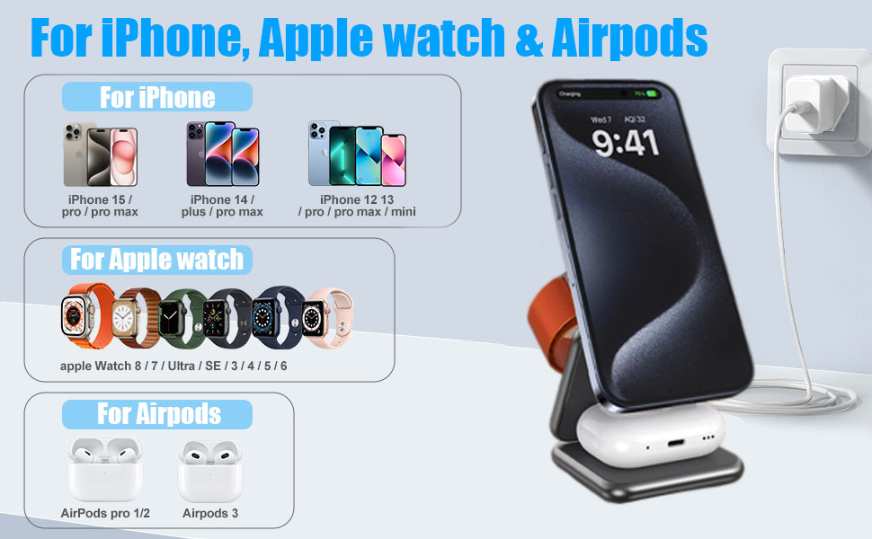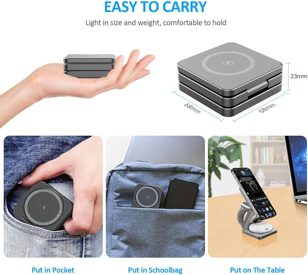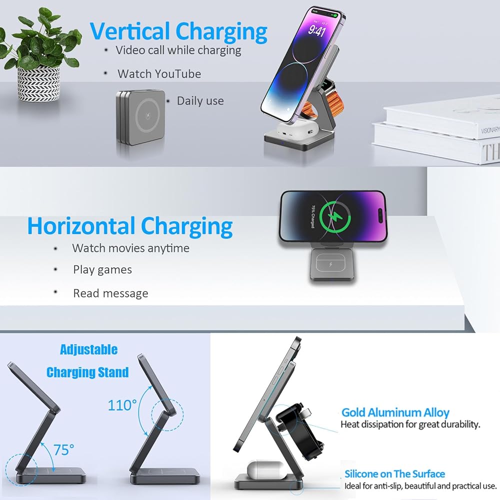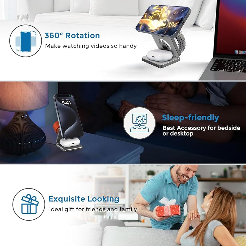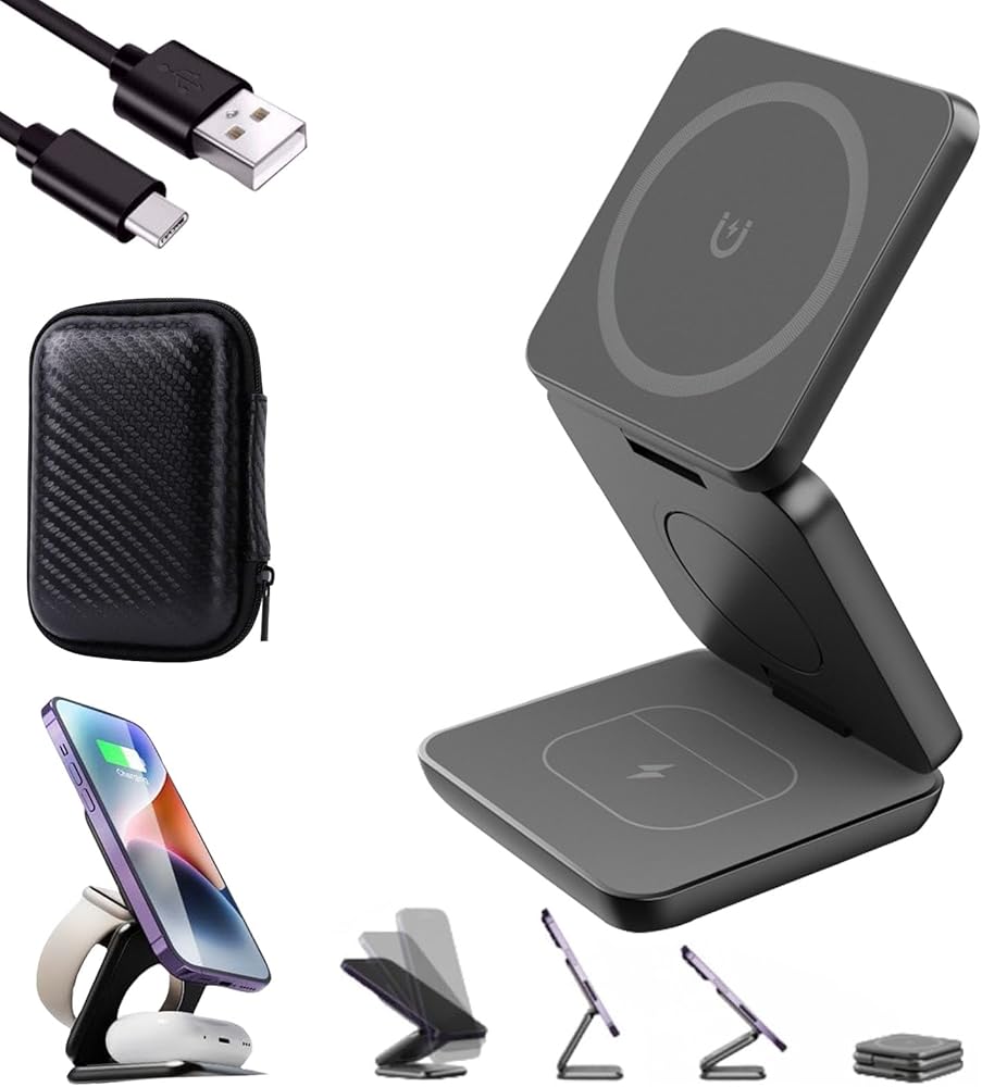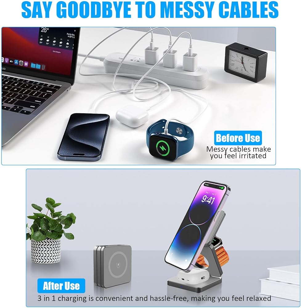 【شاحن لاسلكي مغناطيسي قابل للطي】تسمح لك محطة الشحن هذه بشحن iPhone وApple Watch وAirpods بشكل مريح في نفس الوقت باستخدام كابل واحد فقط. بفضل ملف الحث المتكامل واسع النطاق وتقنية الشحن اللاسلكي المتطورة، يمكنك الاستمتاع بتجربة شحن أنيقة تقضي على متاعب الأسلاك المتشابكة.