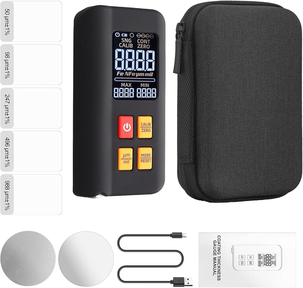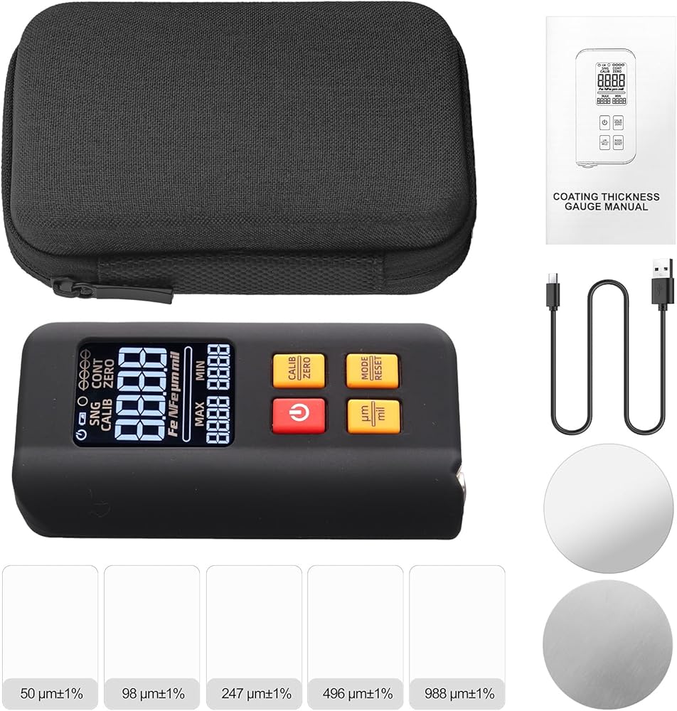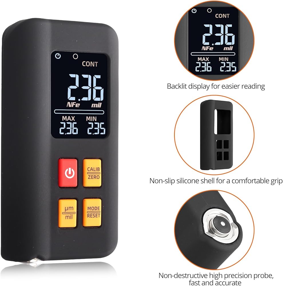 【A Useful Thickness Meter】 Highly accurate to quickly and accurately measure thickness of coating or plating on almost all kinds of metal surface. Ideal for checking the car painting thickness checker, like used cars paint, powder coating, anodized aluminum, bathroom fittings, bike frames, stadium seats, outdoor sheds, furniture, swing sets, cabinets and lockers, computers, appliances, and toys.