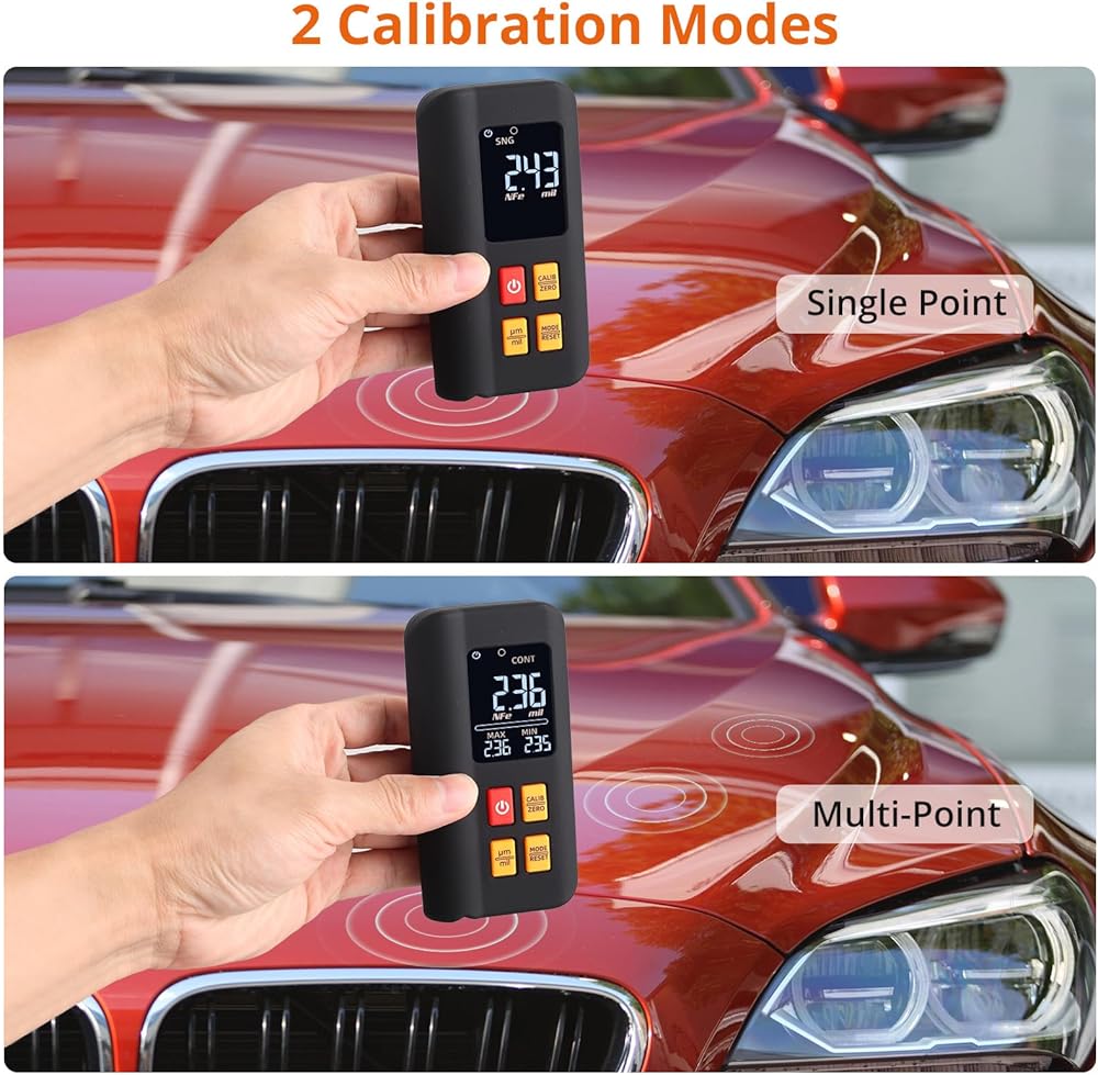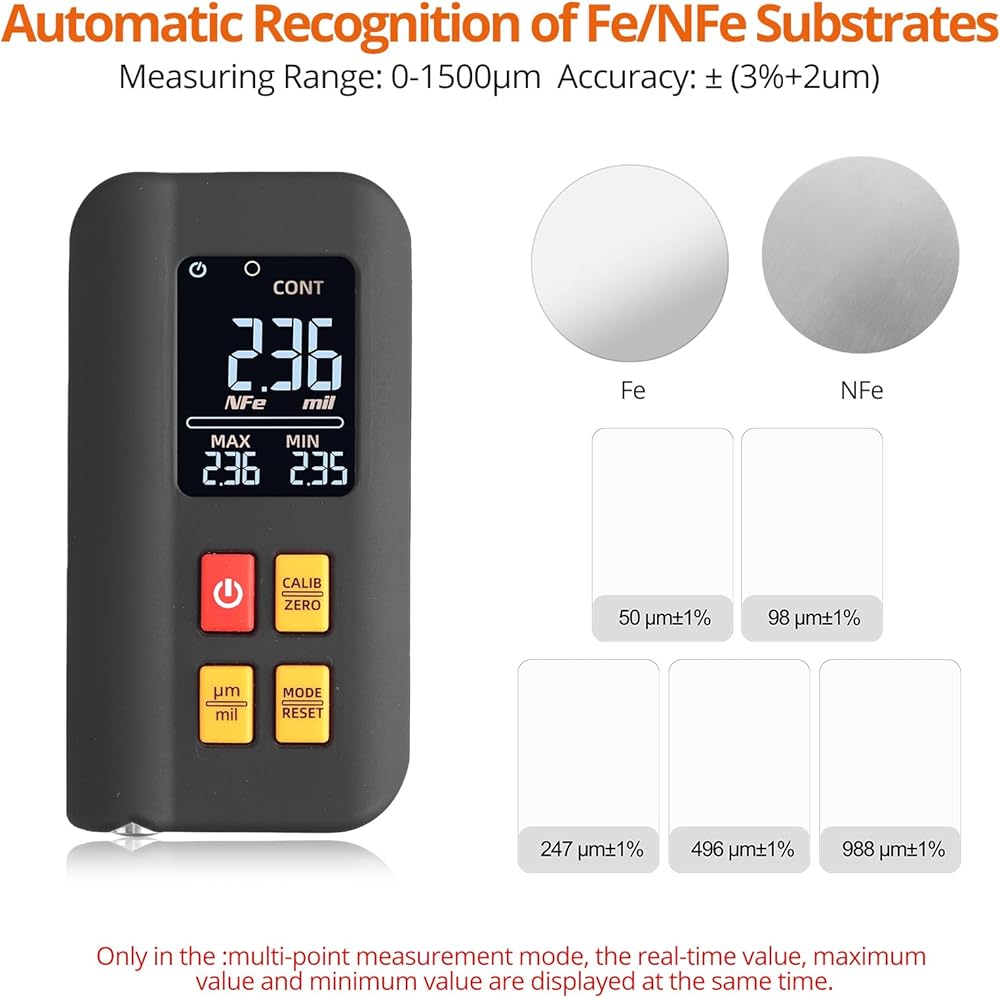 【High Accuracy Thickness Gauge】 The gauge provides non-destructive, fast and accurate coating thickness measurements. Range: 0-1500µm (0-59.1mils), resolution: 0.1µm/0.01mils, accuracy: 3%+2µm. It can help quickly check whether a car has been painted or repainted by the original manufacturer.