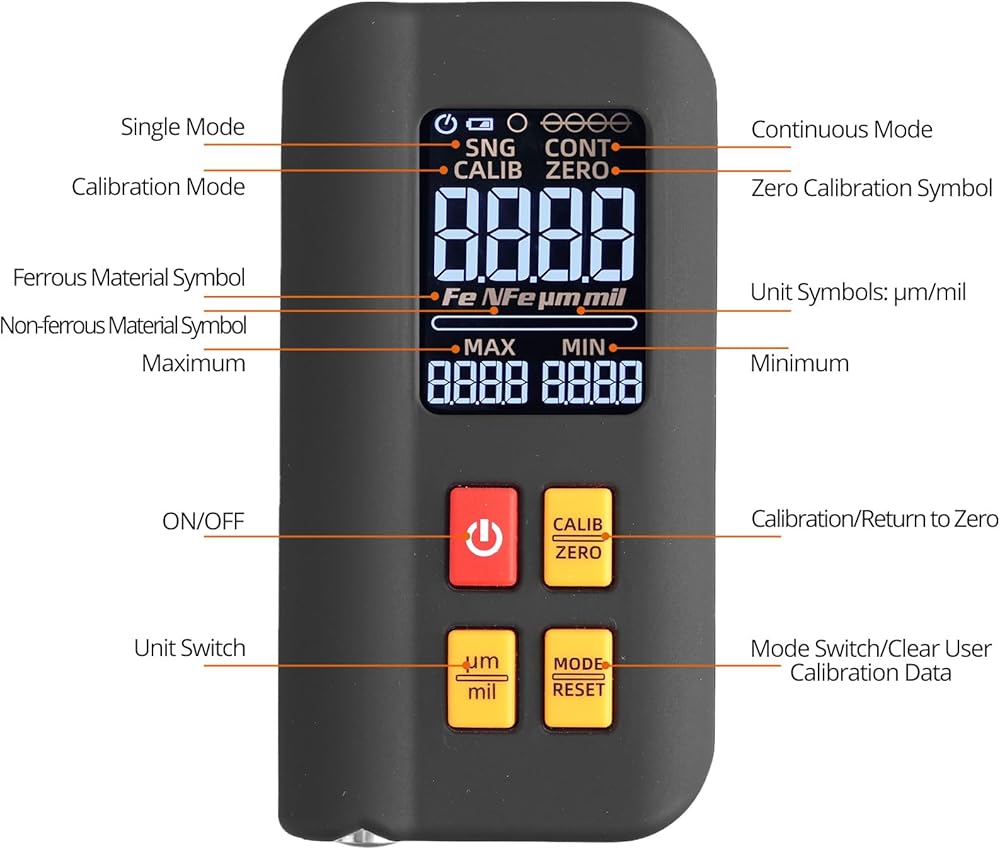 【Easy to Read Display】Automatic Color Backlight Large Screen display shows metal type, single/multipoint working mode, number, battery status, and readings in µm/mil units. Mini shape, easy to fit in your pocket or palm.