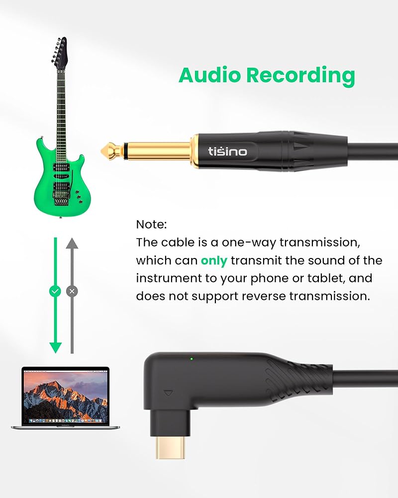 [توافق واسع] يتمتع كابل جهاز تسجيل الجيتار ستيريو TS إلى USB C مقاس 6.35 مم بتوافق واسع مع معظم أجهزة الواجهة من النوع C، مثل الهواتف الذكية والأجهزة اللوحية وأجهزة الكمبيوتر المحمولة وما إلى ذلك. ملحوظة: كابل USB C هذا مخصص فقط لإدخال الصوت الأحادي، وليس لإخراج الصوت.