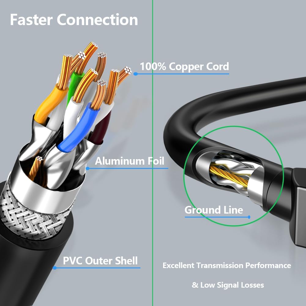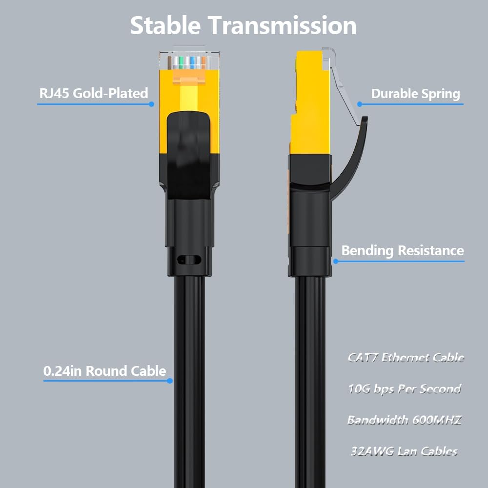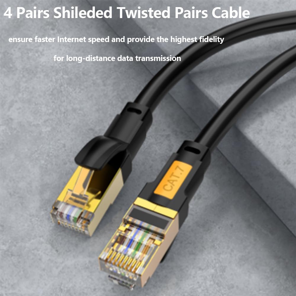 • Stability and Durability: our Cat7 ethernet cord uses 100% oxygen-free copper inside. Double shielded Twisted Pair (STP) copper wires protect against external Electro-Magnetic Interference (EMI); Gold-plated RJ45 connectors are for higher sensitivity and better stability; Each twisted pair contain one ground wire which can effectively reduce noise & interference.
