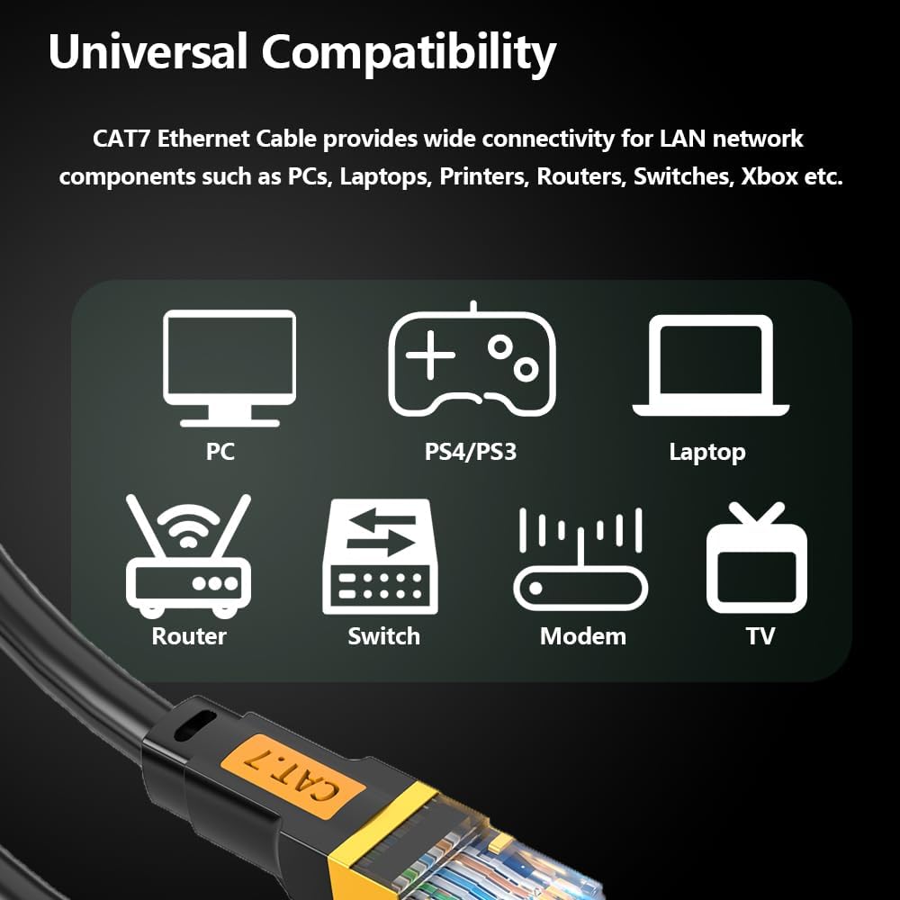 • Wide Compatibility: This Cat7 internet cable can be used for Wi-Fi routers, Xbox one, Computer data center, Cloud Server, Network media players, PS4, Hubs and other devices with RJ45 ports. It can also be fully backward compatible with Cat6e, Cat6, Cat5e, Cat5.
