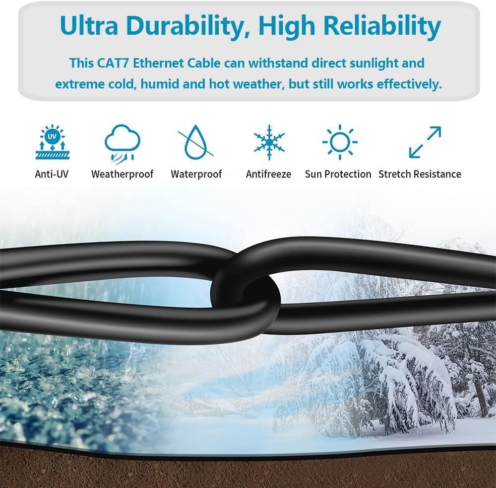 • Weather Resistance: Outdoor rated Cat7 internet cables are shielded by high-quality UV-resistant PVC sheaths, which are anti-aging. It can withstand direct sunlight and extreme cold, humid and hot weather, but still works effectively. With good quality design, it can be buried directly. Suitable for both outdoor and indoor use.