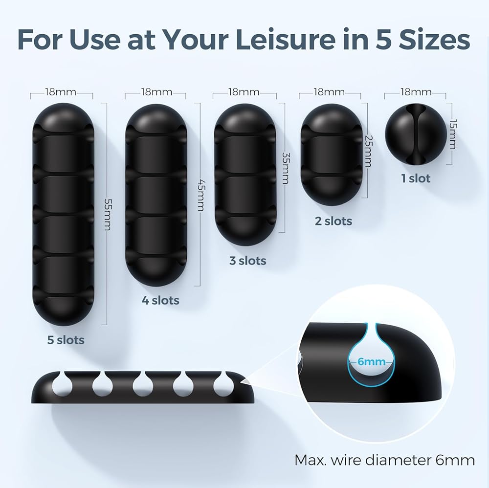 【يناسب العديد من الكابلات】حاملات الكابلات هذه قادرة على حمل كابلات يصل قطرها إلى 6 مم، مما يجعلها مثالية لتنظيم مجموعة من الكابلات الصغيرة والمتوسطة الحجم، بما في ذلك شواحن الهاتف وأسلاك USB وكابلات سماعات الرأس والمزيد.
