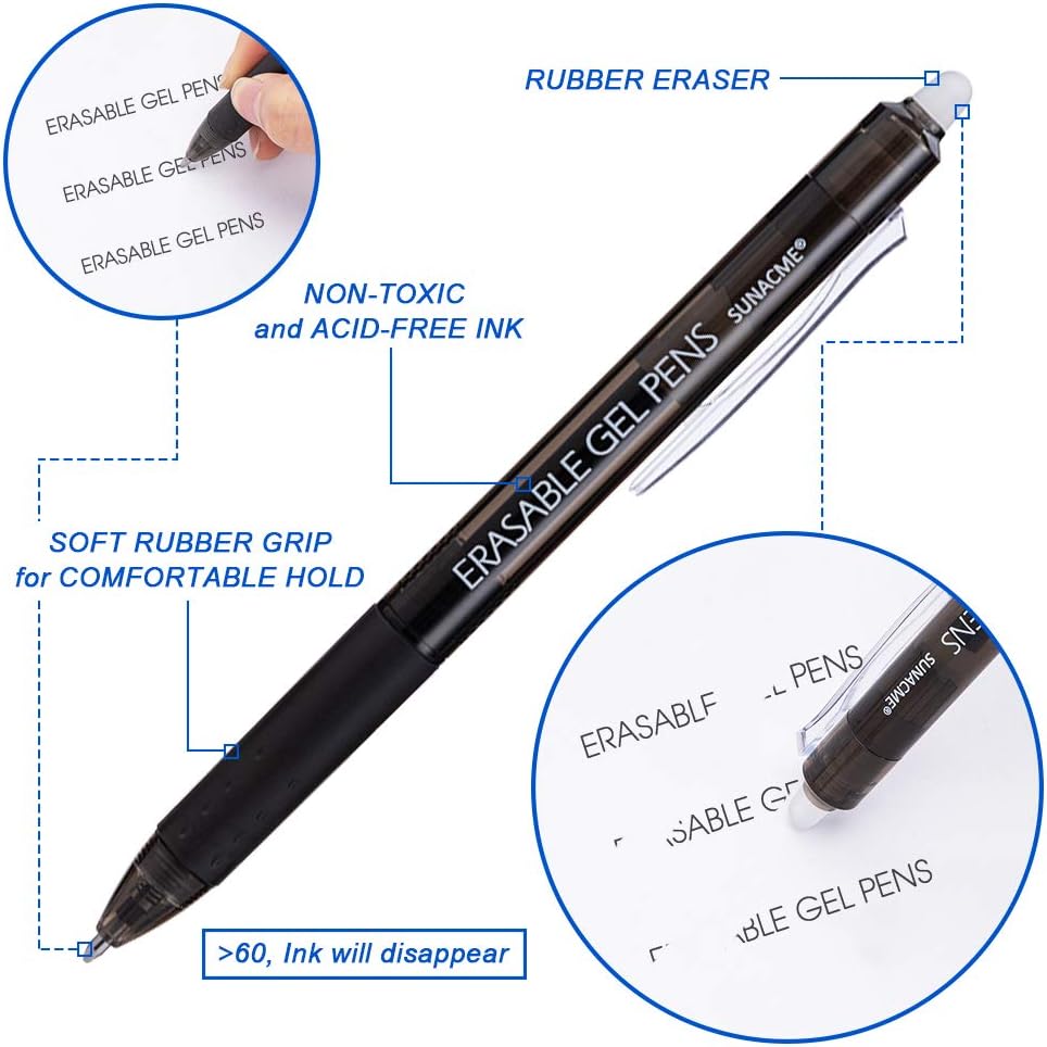 Nontoxic ink, acid-free, non-bleeding, heat erasable. Eraser is at the top of the pen tip, retractable by pressing clip down.
