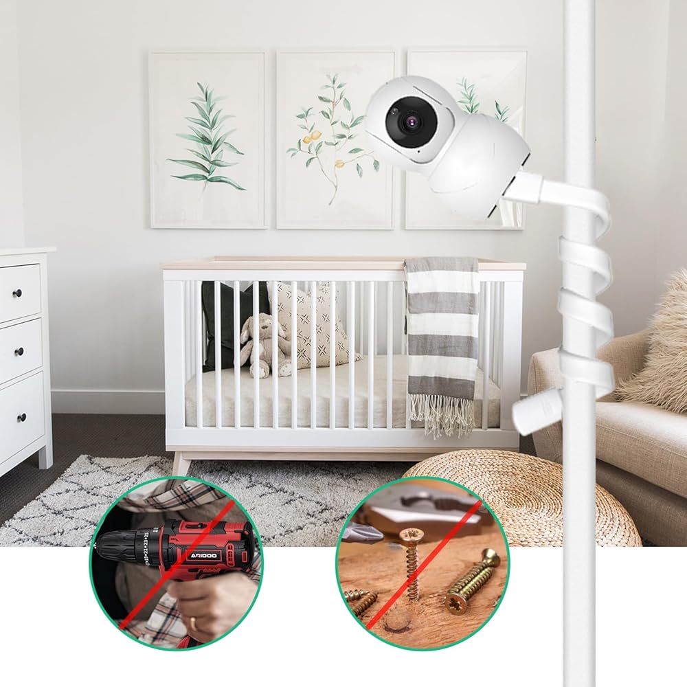 【Portable & Easy-to-Use 】: Its twistable and flexible design effortlessly attaches to the baby crib, without the need for screws, drilling, or wall damage. Our baby camera stand can be disassembled and folded for convenient portability.