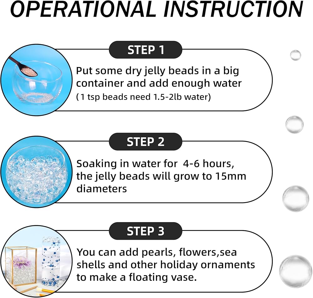 حزمة قيمة: تأتي مع 80000 قطعة من كرات الماء الشفافة في الطرد. يمكن لكل كرة بلورية أن تمتص الماء وتتوسع إلى 15 ملم عند نقعها في الماء لمدة 4-6 ساعات. كمية كبيرة لحشو المزهرية المنزلية والديكورات العائمة.