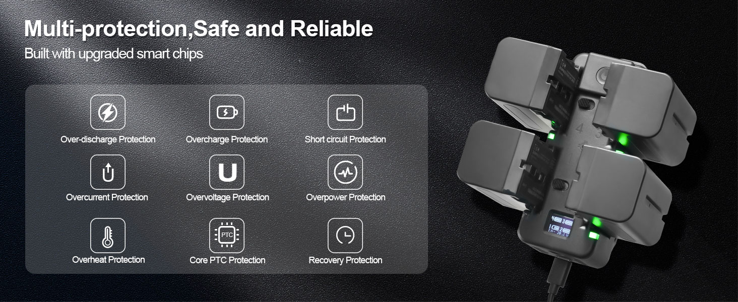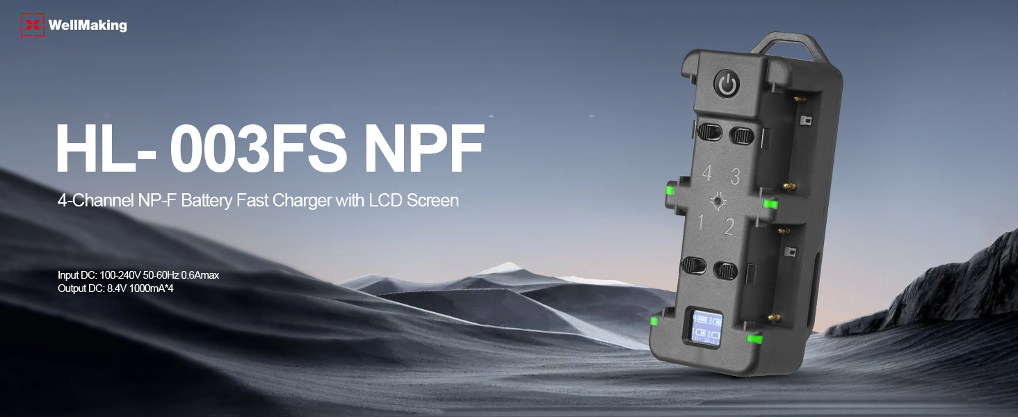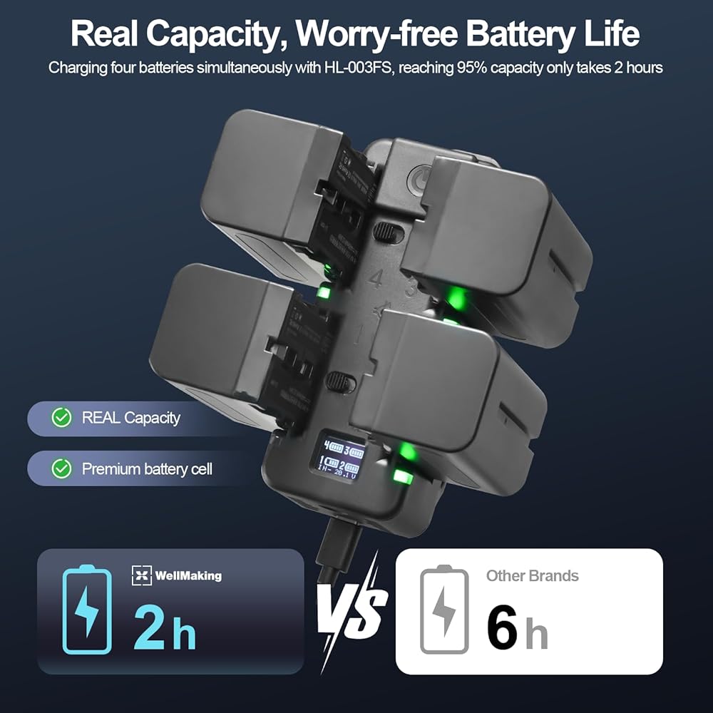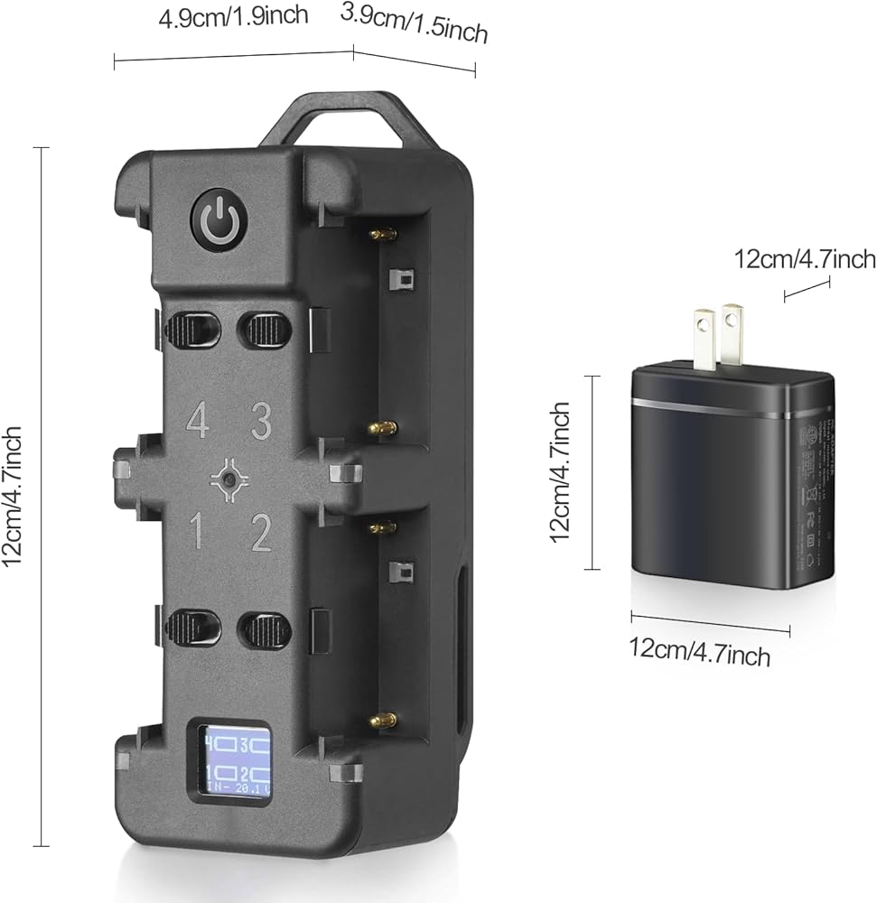 【شاحن رباعي القنوات】 يقوم هذا الشاحن الموفر للوقت بشحن أربع بطاريات Sony NP-F. قوة الشحن 20 فولت/3.25 أمبير. عادةً ما يستغرق شحن أربع بطاريات بسعة 95% في وقت واحد حوالي ساعتين فقط. خفيفة الوزن ومحمولة للسفر.