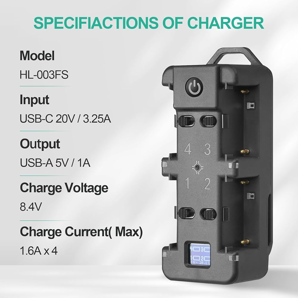 【بنك طاقة مؤقت】 يمكن أن يعمل هذا المنتج (HL-003FS) أيضًا كبنك طاقة لشحن هاتفك. بعد إدخال بطارية NPF في الفتحة، اضغط مع الاستمرار على زر الطاقة لمدة ثانيتين، ثم يمكنك إمداد هاتفك بالطاقة باستخدام كابل USB. ملاحظة: لا يمكن شحن البطاريات والهاتف في وقت واحد.