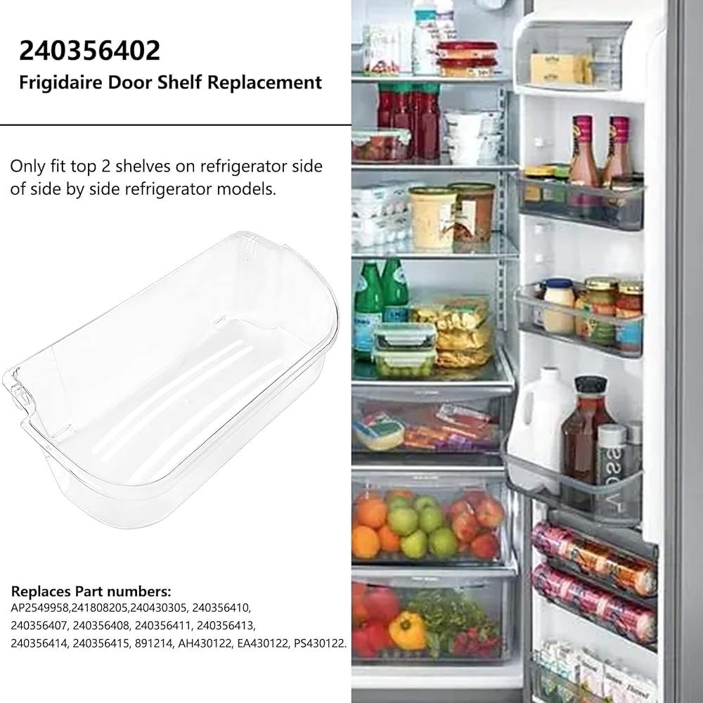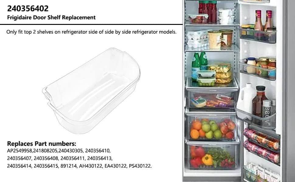 3.Compatible Brands: Electrolux /Frigidaire /Kenmore /Crosley Gibson /Kelvinator /Westinghouse. Only fit for top 2 shelves on refrigerator side of side by side refrigerator models. Not for the bottom slot or freezer side door, does not fit 240324502 and 240363702.