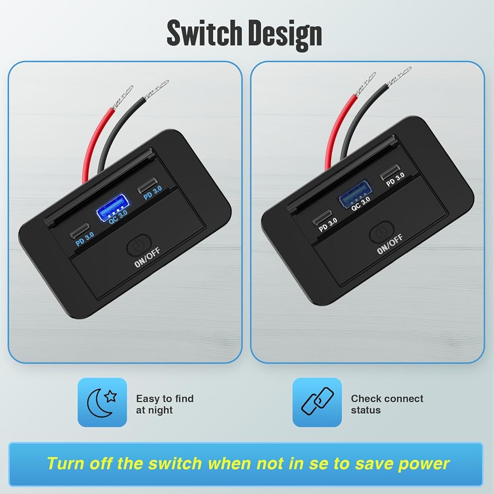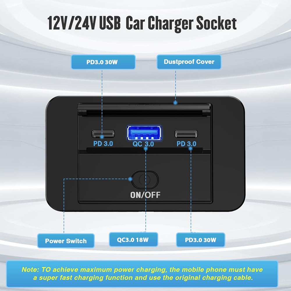 【مقبس شاحن 3 في 1】لوحة مقبس الشحن هذه مجهزة بمنافذ PD3.0 مزدوجة ومنفذ QC3.0 واحد، جهد الإدخال: 12-24 فولت. اشحن جميع أجهزة Android وiOS بأقصى سرعة شحن. ملحوظة: للحصول على أقصى قدر من الطاقة، يجب أن يتمتع الهاتف بشحن فائق السرعة واستخدام كابل الشحن الأصلي.