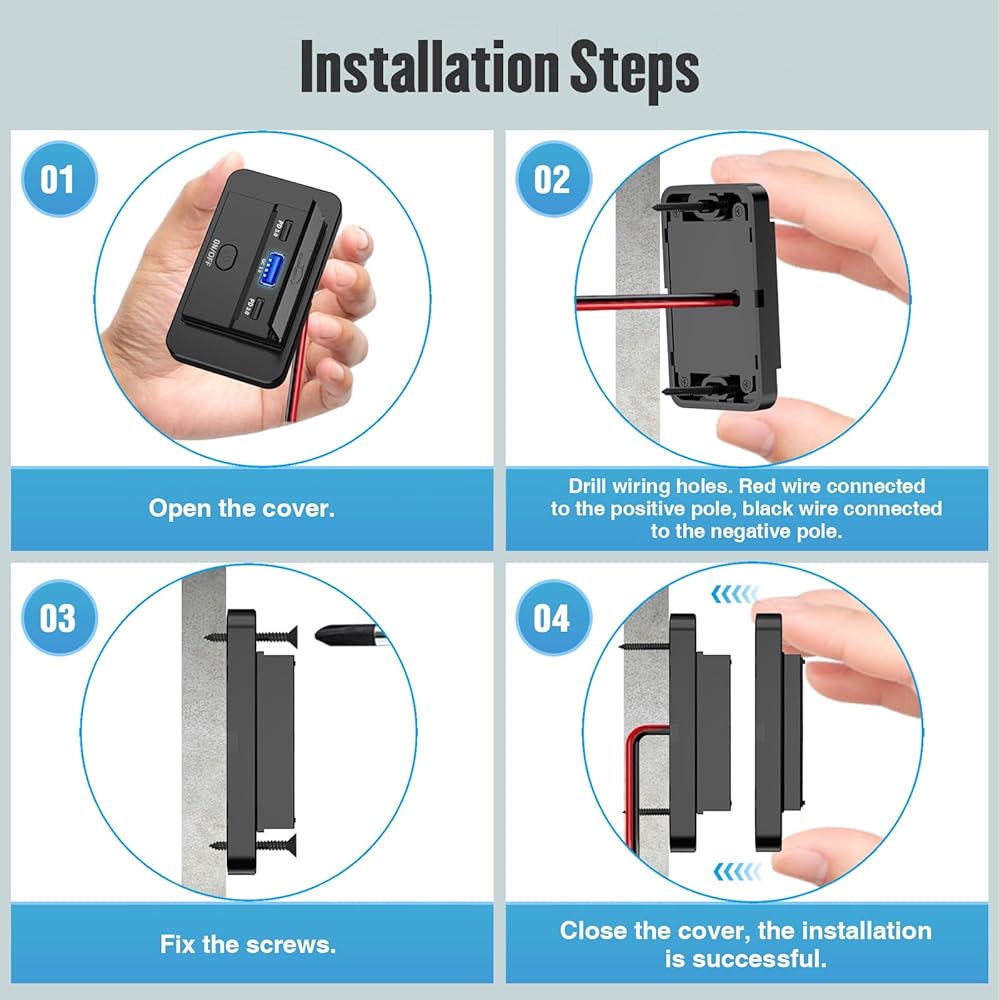 【تركيب بسيط】يتم تركيبه على السطح، ومثبت على سطح مستو، ومسمّر للتثبيت، وثقب فتحات صغيرة لوضع السلك بداخله. قم بتوصيل السلك الأحمر بالقطب الموجب والسلك الأسود بالقطب السالب.
