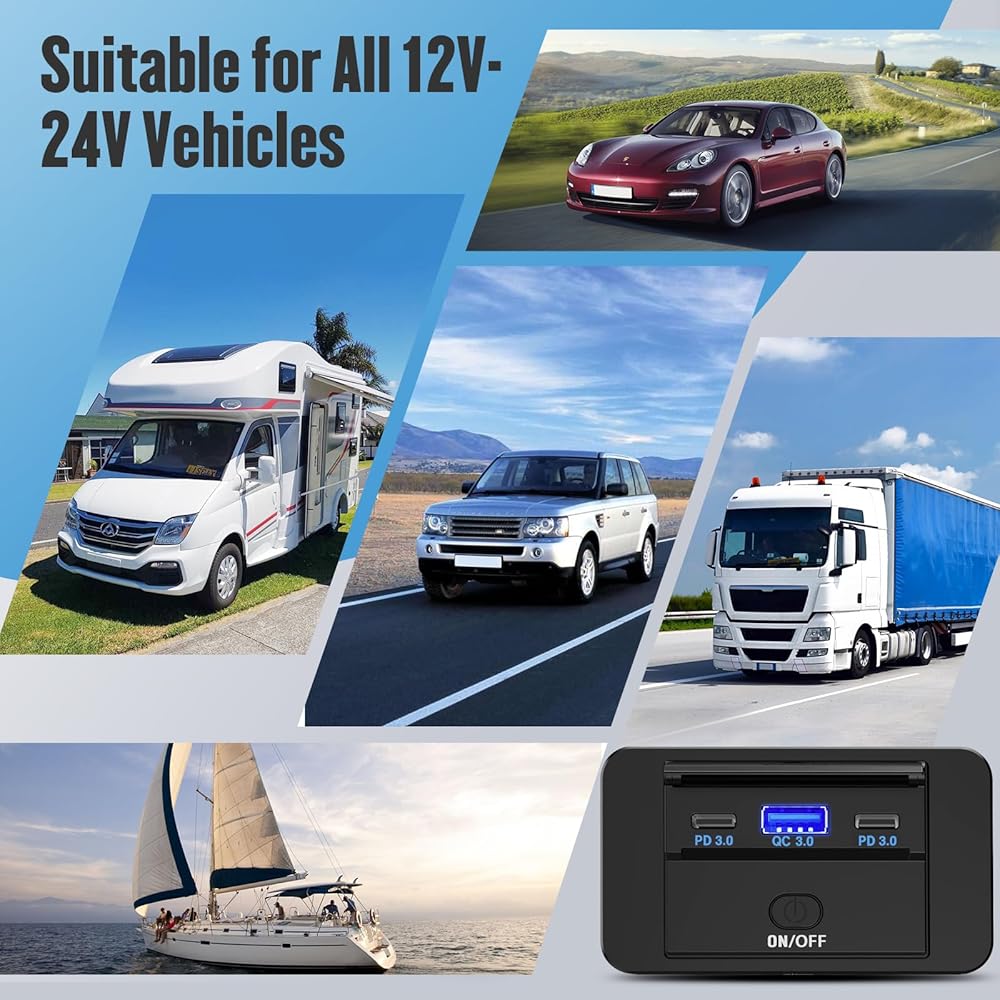 منفذ USB 12 فولت RV نوع C مع مفتاح الطاقة 78 وات مزدوج PD3.0 USB وQC3.0 مقبس شحن سريع 12 فولت 24 فولت شاحن سيارة RV لوحة التبديل شاحن سيارة مع غطاء مقاوم للماء للقوارب البحرية ATV Motorcycl
