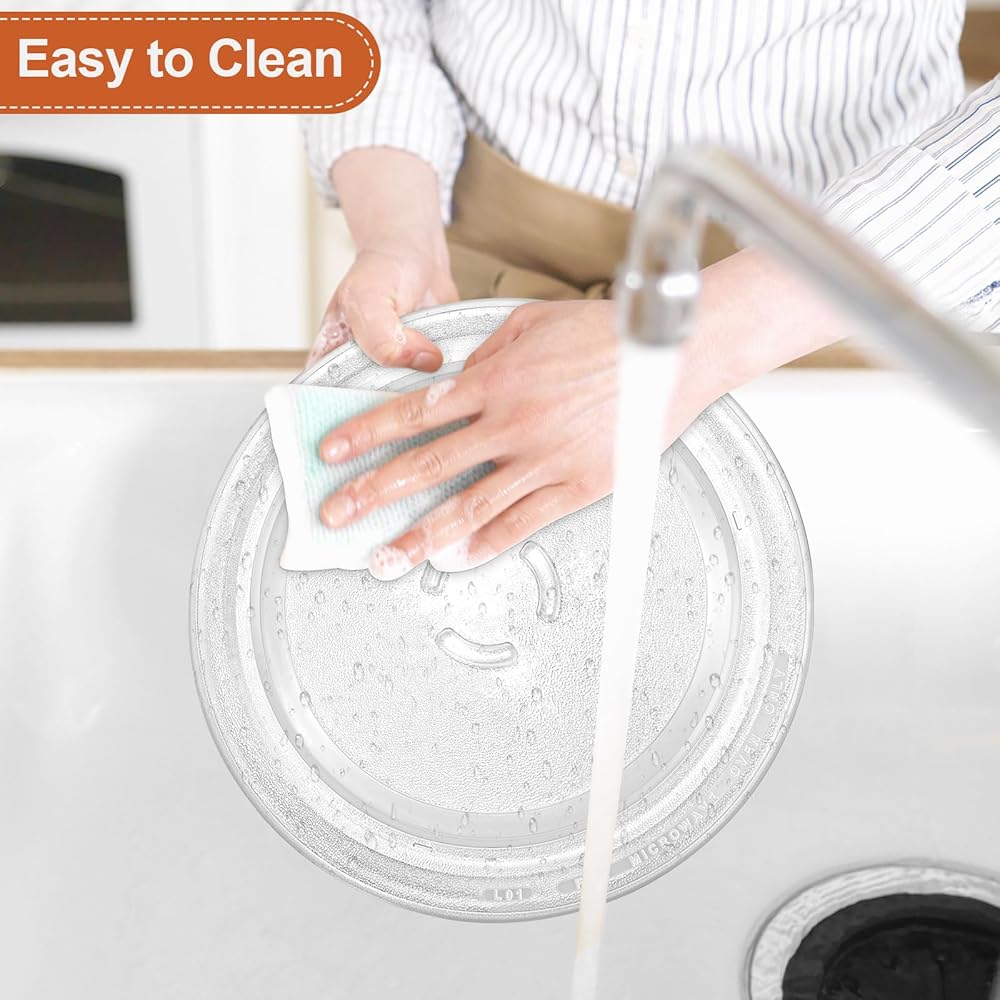 𝐄𝐚𝐬𝐲 𝐭𝐨 𝐜𝐥𝐞𝐚𝐧: The replacement microwave glass turntable tray adopting a spill-proof edge design collects oil/water droplets/food that leaks during cooking. The microwave glass plate can be cleaned with cloth, paper towels, soap or dishwasher, easy to clean. Save energy and time.