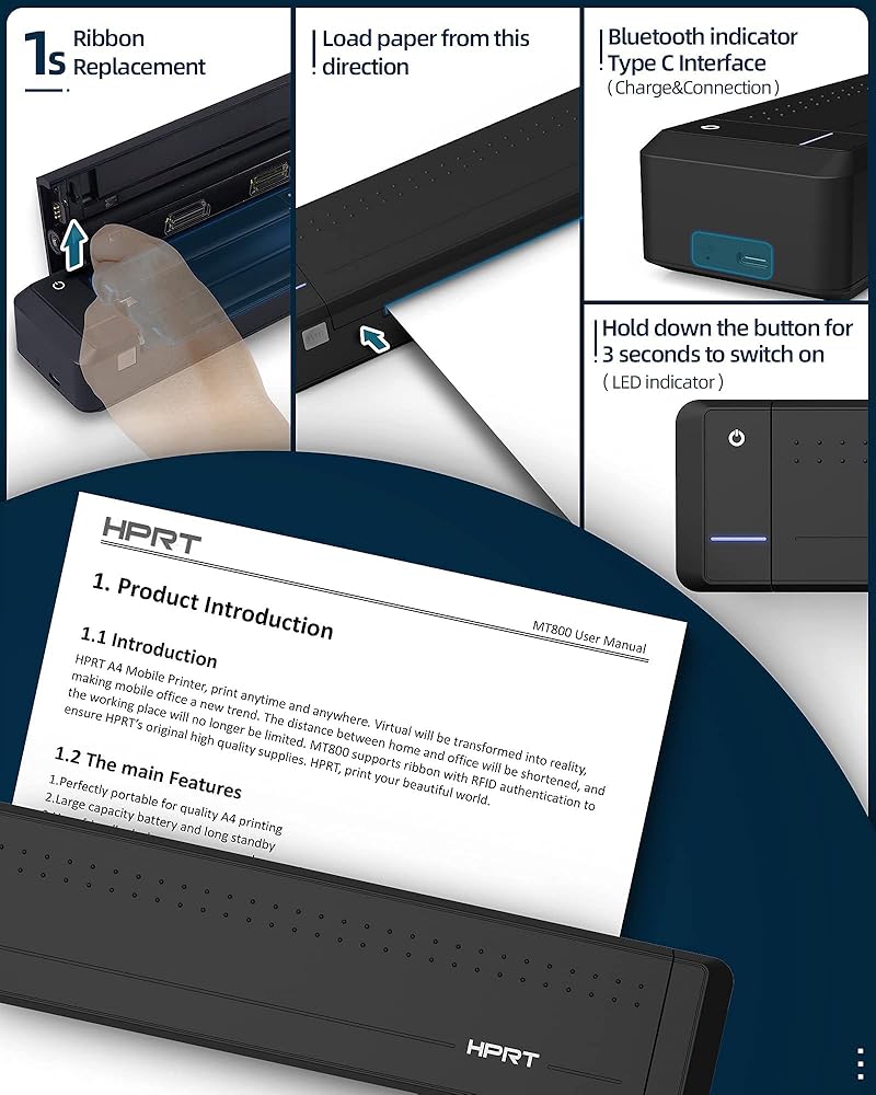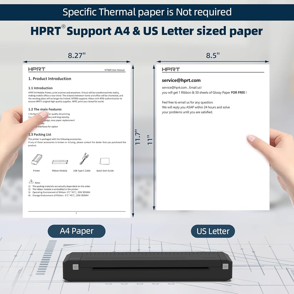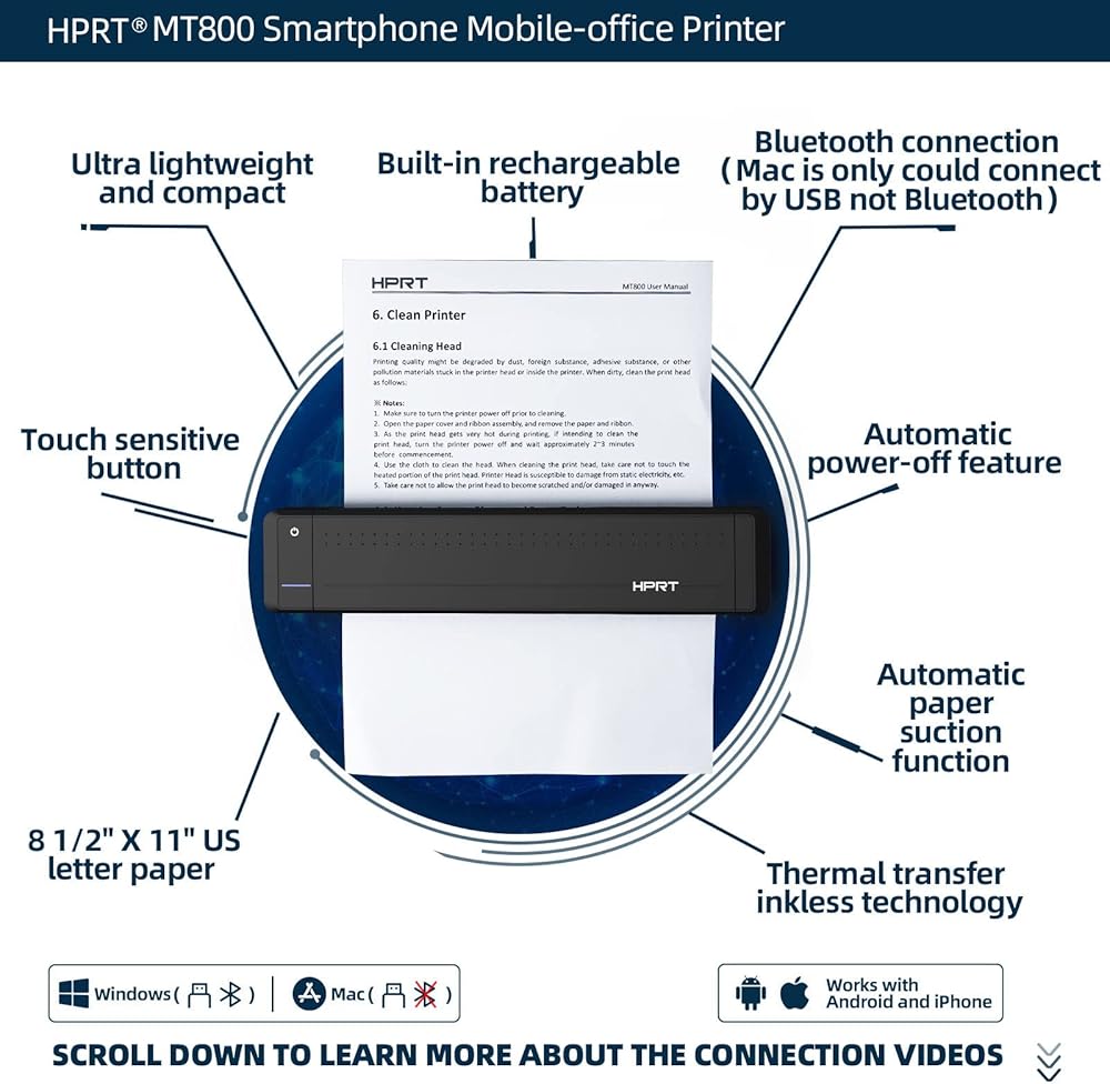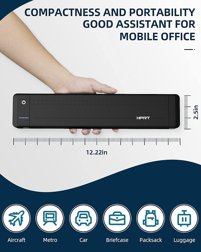 حجم صغير جدًا وقابلية للحمل - يبلغ حجم طابعة السفر المحمولة HPRT حوالي ضعف حجم جهاز iPhone لتناسب حقيبة الكمبيوتر المحمول أو حقيبة الظهر أو الأمتعة؛ وهي جيدة بشكل خاص للطباعة في حالات الطوارئ أثناء التنقل أو أثناء السفر بغرض العمل؛ هل ترغب في العمل والطباعة باستخدام الطابعة بجوار حمام السباحة/الشاطئ، أو حتى أعلى الجبل؟ اطبع في أي وقت وفي أي مكان. (ملاحظة: MT800 هي طابعة أحادية اللون تغذي صفحة واحدة في كل مرة نظرًا لطبيعة الطابعة المحمولة، وليست ماسح ضوئي أو طابعة ملونة)