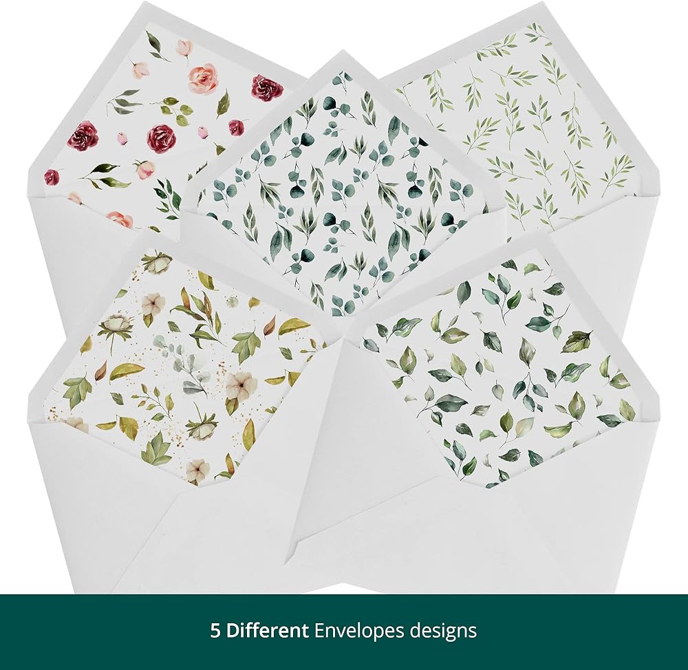 صندوق تشكيلة بطاقات التعاطف الخاص بنا مع الأظرف يأتي مع 50 ظرفًا أبيضًا واضحًا - كل منها بخمسة أنماط زهور مختلفة في الداخل (10 من كل نمط) مما يخلق مفاجأة فريدة غير متوقعة لمتلقي بطاقات التهنئة الكبيرة هذه