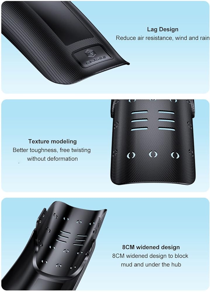 قوة عالية: يتمتع واقي الطين للدراجة بقوة عالية، وليس من السهل أن يتشوه أو ينحني في الشمس، وليس من السهل أن يصبح هشًا في الشتاء البارد، مع تصميم مقاوم للرياح لتقليل الرياح.