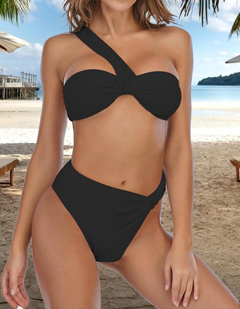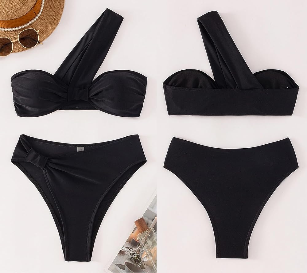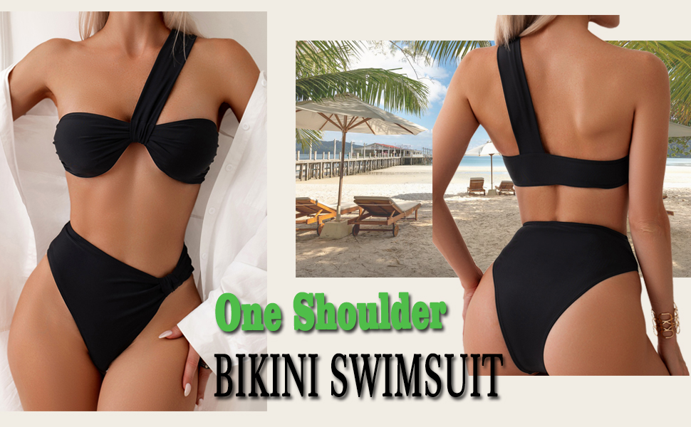قطعة بيكيني علوية بكتف واحد: الجزء العلوي من البكيني عبارة عن صورة ظلية على شكل عصابة مع حزام واحد عريض يغلق الجزء الأمامي، مما يخلق مظهر كتف واحد. ويمكن وضع الحزام على الكتف الأيسر أو الأيمن.