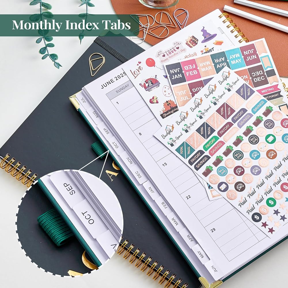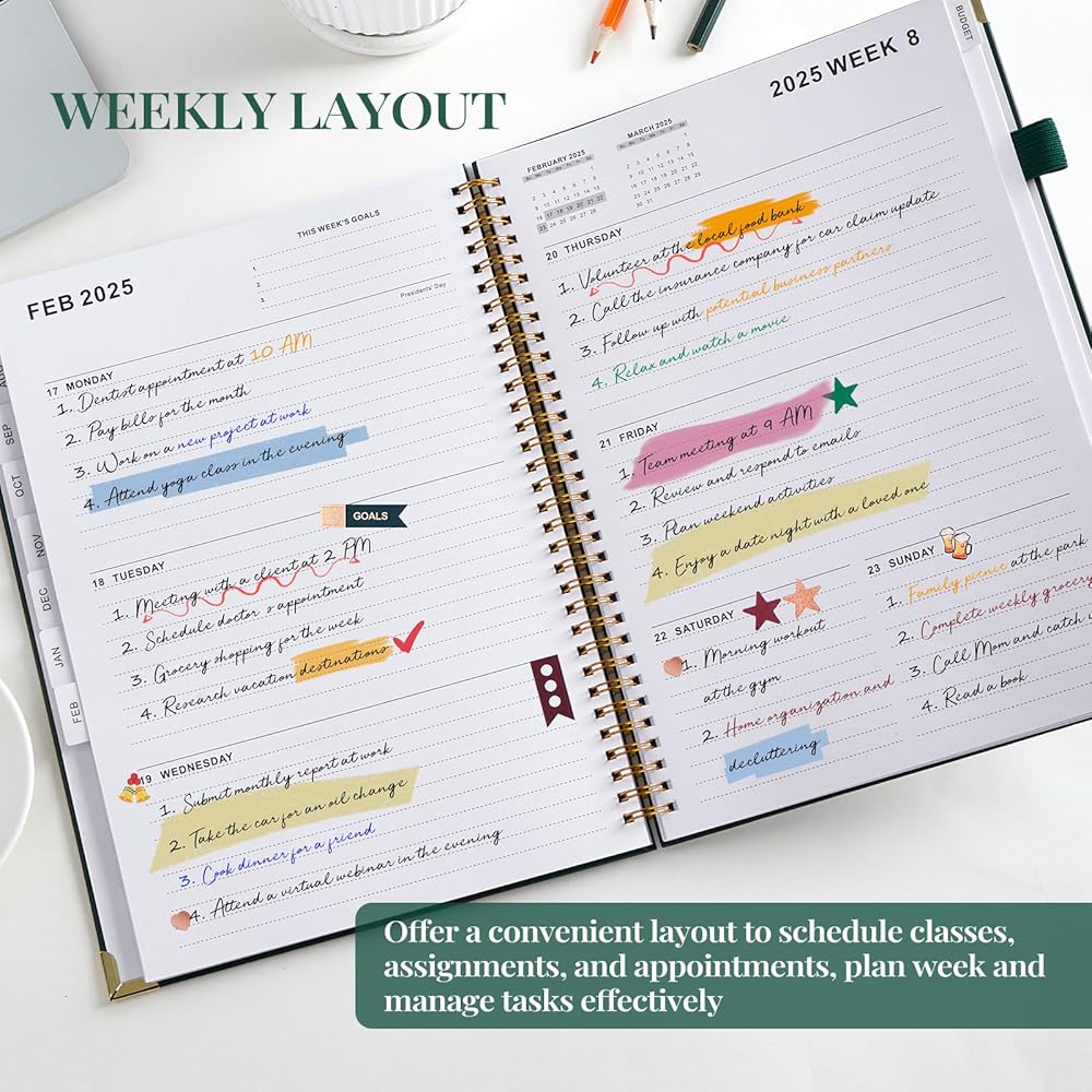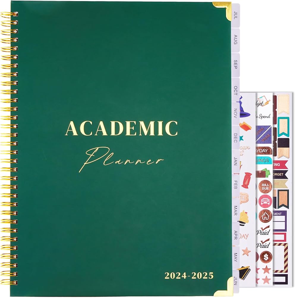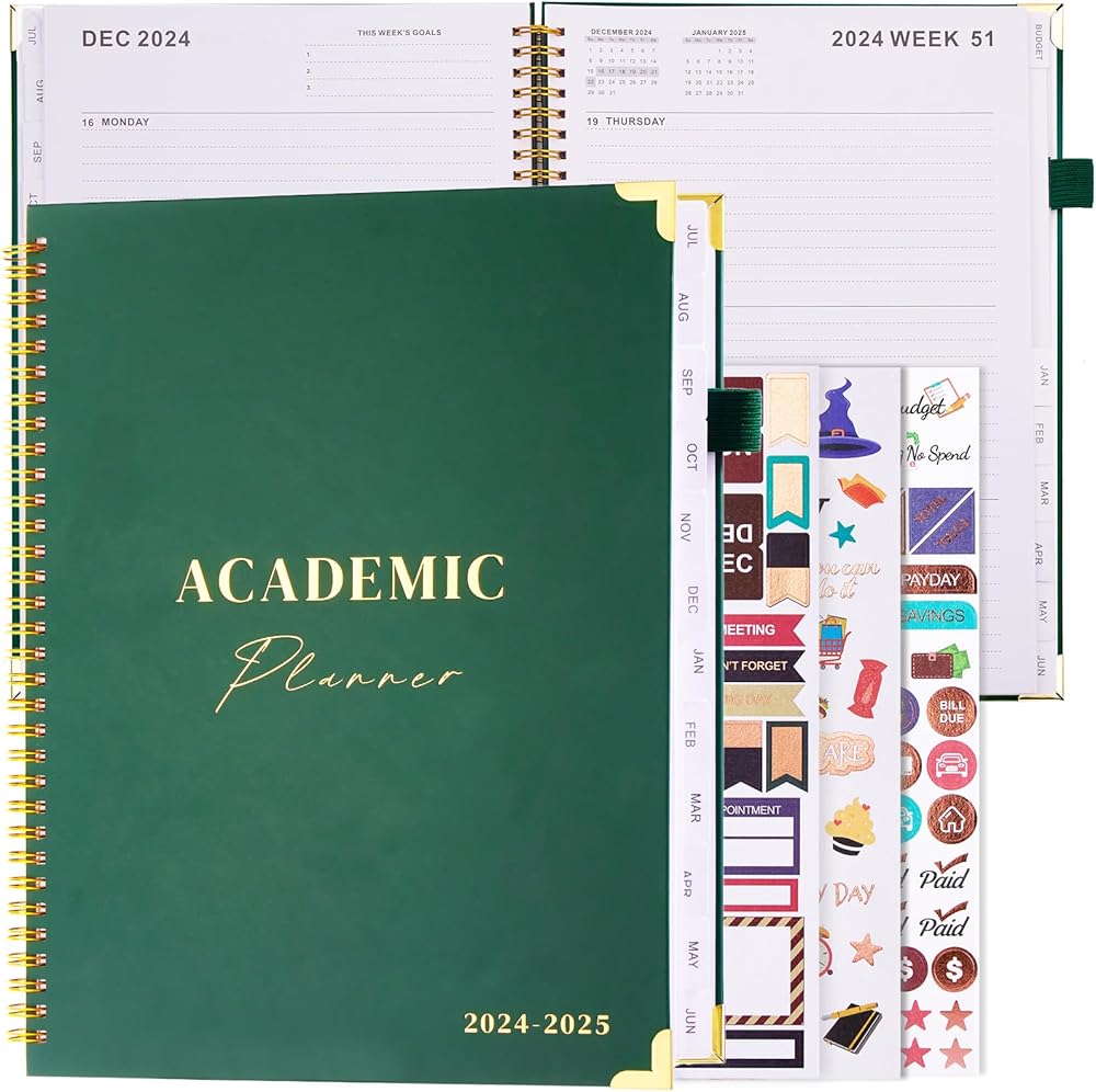 تصميم خاص: مخطط الطلاب الكبير مقاس 8.5*11.5 بوصة مع 12 علامة تبويب شهرية سهلة الاستخدام. اختر تصميمًا حلزونيًا لسهولة تقليب الصفحات والمرونة في مخططك الأكاديمي. قم بزخرفة الغلاف بحروف من رقائق الذهب لإضفاء لمسة من الأناقة والرقي. عزز المتانة من خلال زوايا معدنية واقية، وحزام ربط آمن، وحلقة قلم لسهولة الوصول، وجيب لتخزين الأوراق أو الملاحظات السائبة. مخطط أسبوعي مع ملصقات يمكنها تزيين الصفحات.