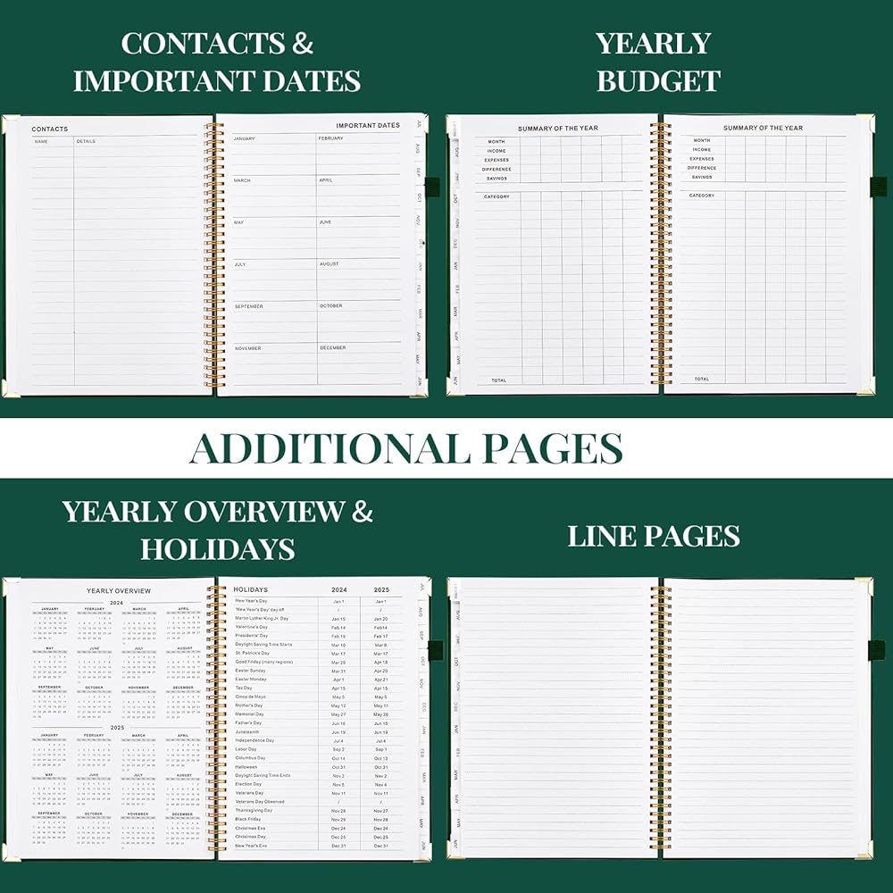 صفحات إضافية عملية: قم بتضمين صفحات إضافية عملية في مخططك الأكاديمي، مثل نظرة عامة سنوية لعام 2024-2025 تعرض العطلات والتواريخ الرئيسية. قم بتضمين أقسام لجهات الاتصال المهمة ومعلومات الطوارئ لتسهيل الوصول إلى التفاصيل الأساسية في مخططك.