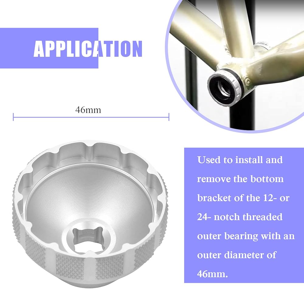 【التطبيق】: يستخدم لتثبيت وإزالة الدعامة السفلية للمحمل الخارجي الملولب 12 أو 24 درجة بقطر خارجي 46 مم.