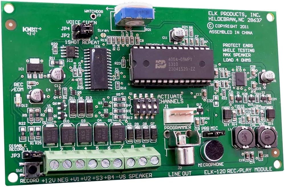 The ELK-120 v.3 features 4 channels that can be configured as 2 channels of siren and 2 channels of voice, or all 4 channels can be used for voice. Either way the voice channels are fully recordable and are stored in non-volatile re-programmable memory. Total time of recording is 8 minutes. The Siren channels offer a choice of: Classic Yelp Sound, Temporal Coded Horn, or Pulsing Industrial Horn. The siren sounds can be triggered in sequence with the voice channels. The channels can be configured to play once or to repeat endlessly. Two channels support our unique ComboTrigger feature, especially designed for controls that have a single alarm output with a pulsing option for fire or burglary. When pulsed, the Temporal Coded Horn fire signal is sounded. The optional ELK-129 Computer Interface may be used to download .WAV sounds from a PC to the ELK-120. Also available is the ELK-124 offering eight recordable voice channels of 1 minute each. Main Features Four Channels Configurable as: Two Siren and Two Recordable Voice OR Four Recordable Voice Maximum record time is 8 minutes divided between the number of voice channels Siren Sounds: Classic Yelp Siren, Temporal Coded Horn, and Pulsing Industrial Horn Temporal Coded Horn meets ANSI standard for Audible Emergency Evacuation Signaling Recordings stored in non-volatile memory Voice channels accept momentary triggers “One Shot” or Continuous voice playback settings Option to trigger +V1 and or +S3 channels from a steady or pulsing input (ComboTrigger) Built-in condenser microphone for recording Adjustable speaker volume and current draw General Information Name: ELK 120 Recordable Voice/Siren Module Category: Elk Products Inc., Intrusion & Smart Home, Audio & Visual Devices, Siren Drivers UPC Code: 762158001208 Country of origin: United States. Country of origin is subject to change.
