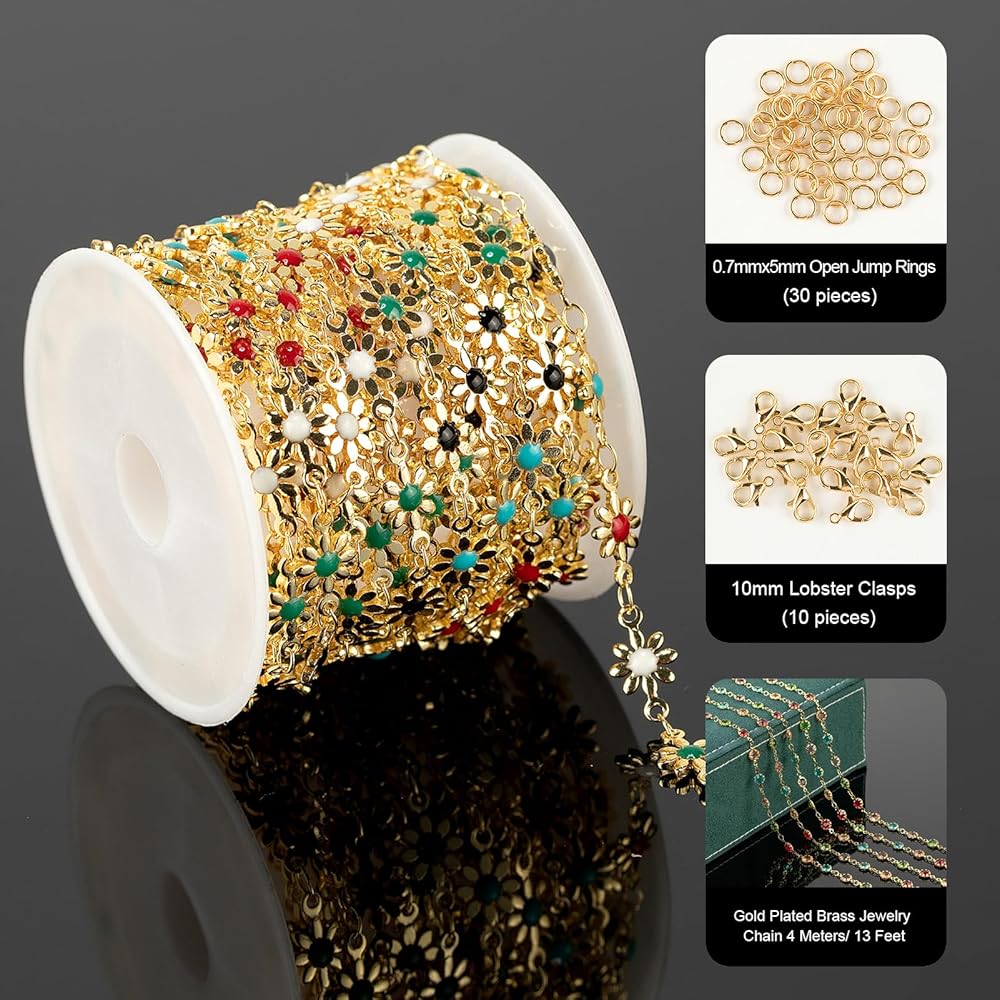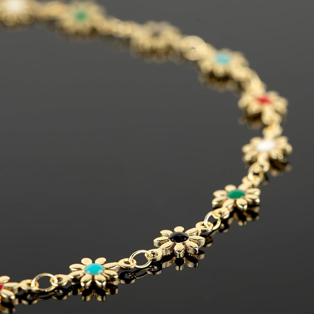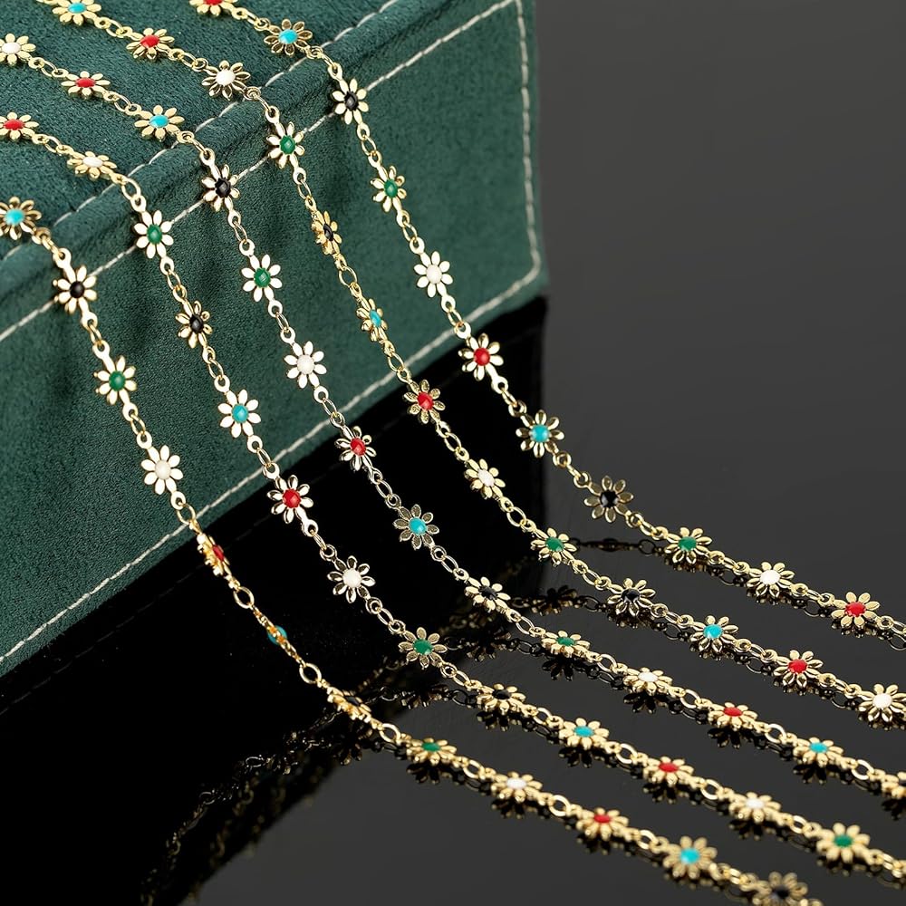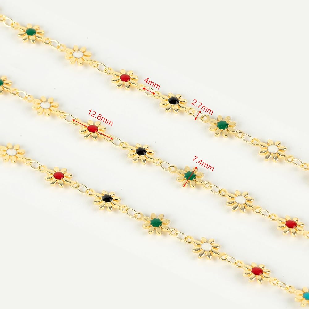 YOUBEIYEE 13 Feet 18K Gold Plated Brass Chain for Jewelry Making Colorful Enamel Daisy Flower Link Chain for Necklace Bracelet DIY Jewelry Making Supplies Findings