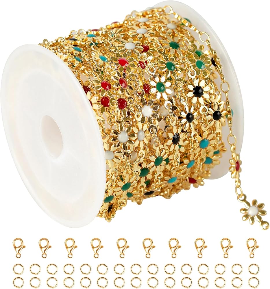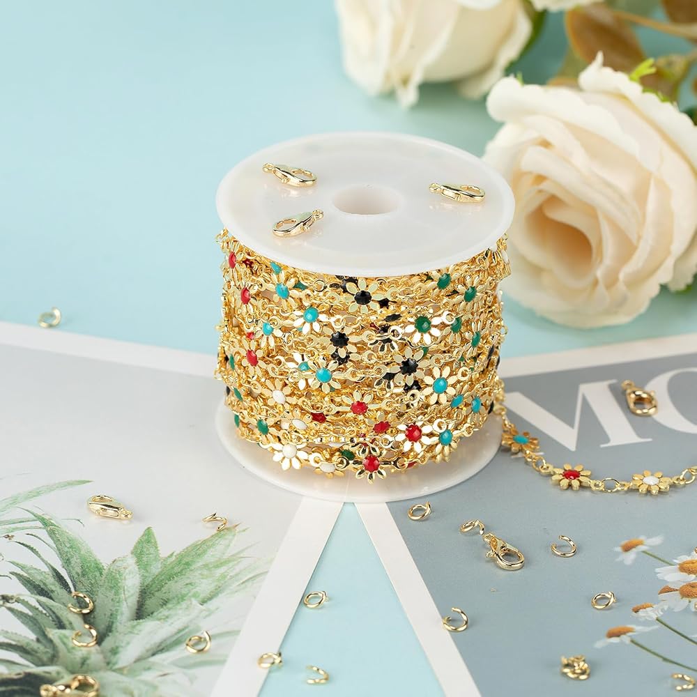 2. Multiple Usages: Fashion enamel daisy chain, perfect to diy making women and girls necklaces, bracelets, anklets, earrings, belly chains, waist chains, leg chains, thigh chains, and other types of jewelry, also can be used as decorative chains to make keychains, pocket chains, wallet chains, purse chains, bag chains, boot chains, dog tag chains, crafts chains, etc. A great gift idea on Valentine's Day, Mother's Day, Halloween, Thanksgiving Day, Christmas, Graduation, Wedding, Anniversary, Birthday, and other special days.