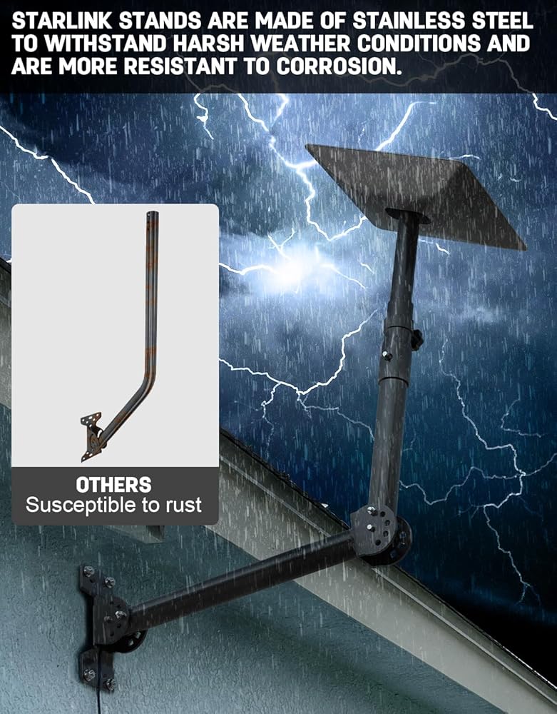 مواد عالية الجودة: مجموعات التثبيت Starlink مصنوعة من مادة الفولاذ المقاوم للصدأ عالية الجودة، وهي أكثر متانة مقارنة بالمنتجات العادية الموجودة في السوق. تم تحسين حامل الحائط ستارلينك الخاص بنا لمنع الصدأ وهو مناسب بشكل خاص للاستخدام الخارجي ويظل ثابتًا ومتينًا حتى في الظروف الجوية القاسية.