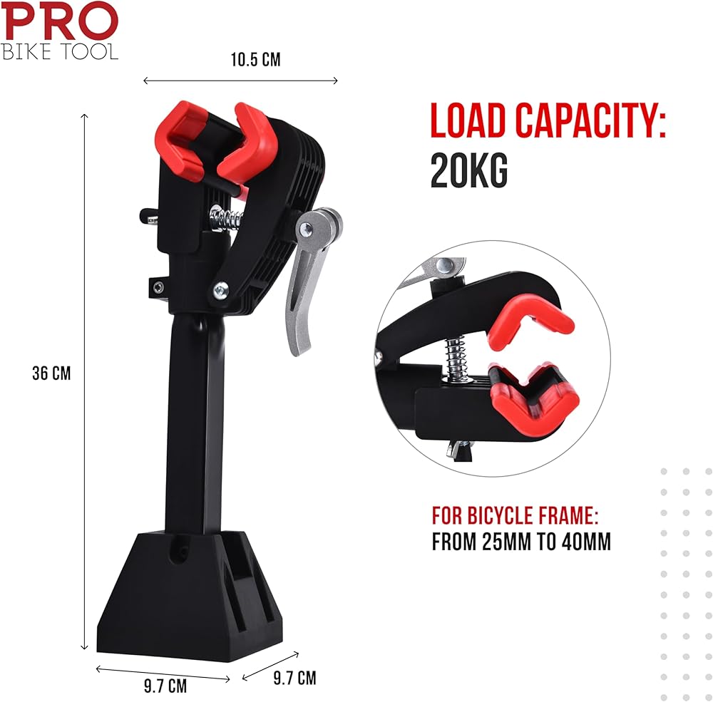 Introducing the Pro-Bike Tool Bike Repair Stand - Rubberised Material, Color 419 & 1805 - Professional Grade, Stable & Durable Bicycle Mechanic RackThe Pro-Bike Tool Bike Repair Stand is the ultimate solution for cyclists seeking effortless maintenance and repairs right at home. This heavy-duty mechanic stand is equipped with a reliable wall clamp and wheel truing adjustment, catering to the needs of both mountain and road bike enthusiasts. Designed with portability in mind, our bike workstand is lightweight and easy to transport, enabling you to bring it along wherever you go. Whether you prefer working on your bike in the comfort of your home or during outdoor adventures, our portable stand has got you covered. Crafted from high-quality materials, our professional-grade bicycle mechanic rack guarantees stability and durability during use, ensuring your bike receives the care it deserves. The static mount and pedal reaper simplify the process of tuning and maintaining your bike, whether you're an experienced pro or just starting out on your cycling journey. Product Dimensions: Item Height: 12 cm (4.72 in) Item Length: 31 cm (12.20 in) Item Width: 20 cm (7.87 in) Item Weight: 1 kg (2.20 lb) Upgrade your bike repair experience with the Pro-Bike Tool Bike Repair Stand. This rubberised material stand, available in Color 419 & 1805, offers unparalleled stability and durability, making it an essential companion for every bike enthusiast. Revolutionize your bike maintenance routine with our top-of-the-line, professional-grade rack.
