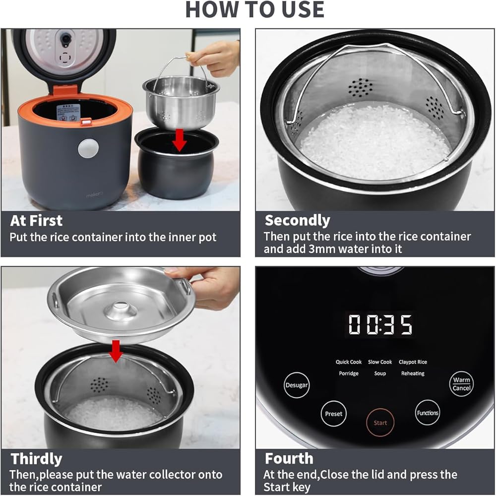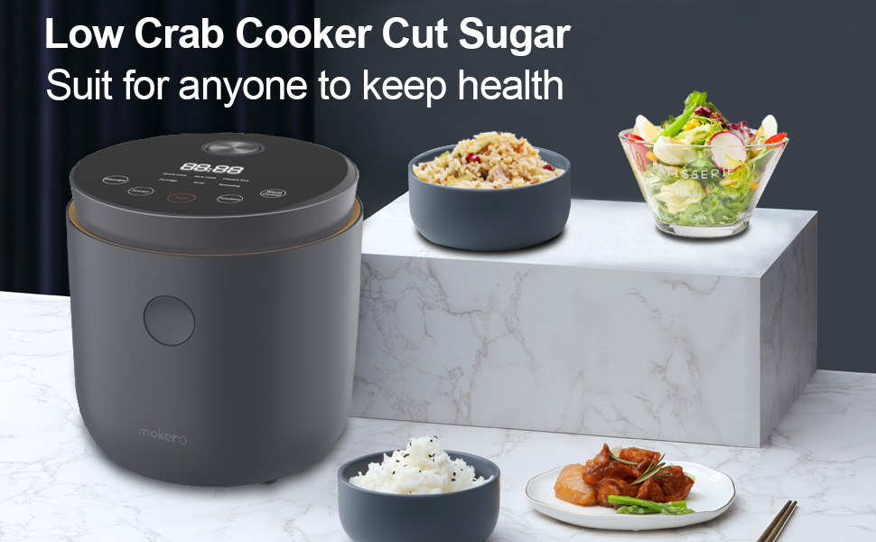 • جهاز طهي الأرز منخفض الكربوهيدرات: تم تصميم جهاز طهي الأرز منخفض الكربوهيدرات لدينا لمساعدتك على تقليل تناول السكر مع الاستمتاع بأطباق الأرز اللذيذة. مع سعة قصوى تصل إلى 2 لتر والقدرة على طهي ما يصل إلى كوبين من وضع طهي الأرز منخفض السكر، فهو مثالي للعائلات الصغيرة أو الأفراد. يضمن الوعاء الكروي الأسود السميك توزيعًا متساويًا للحرارة للحصول على نتائج طهي مثالية.