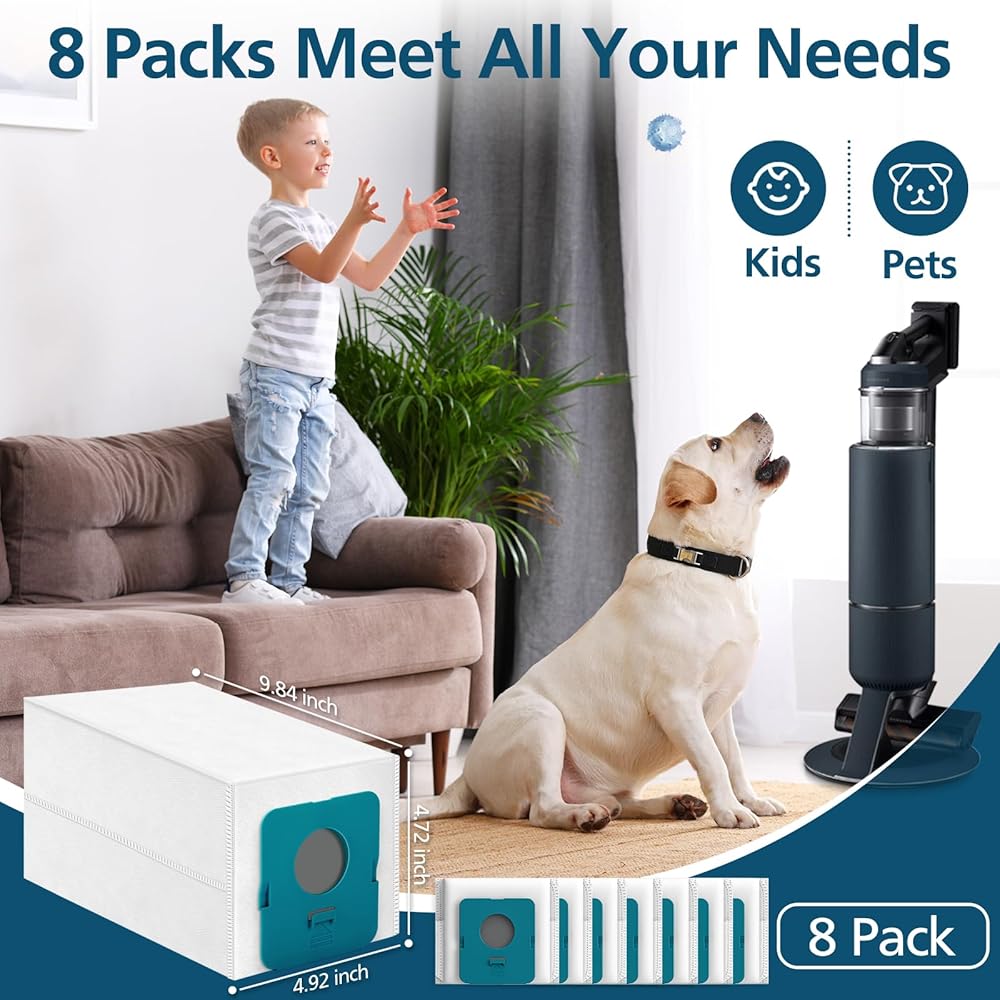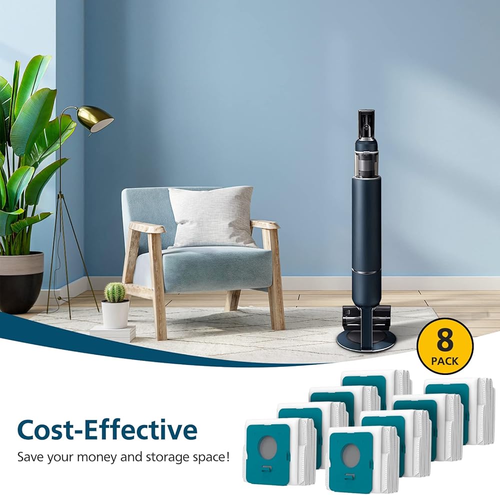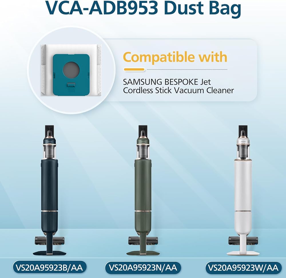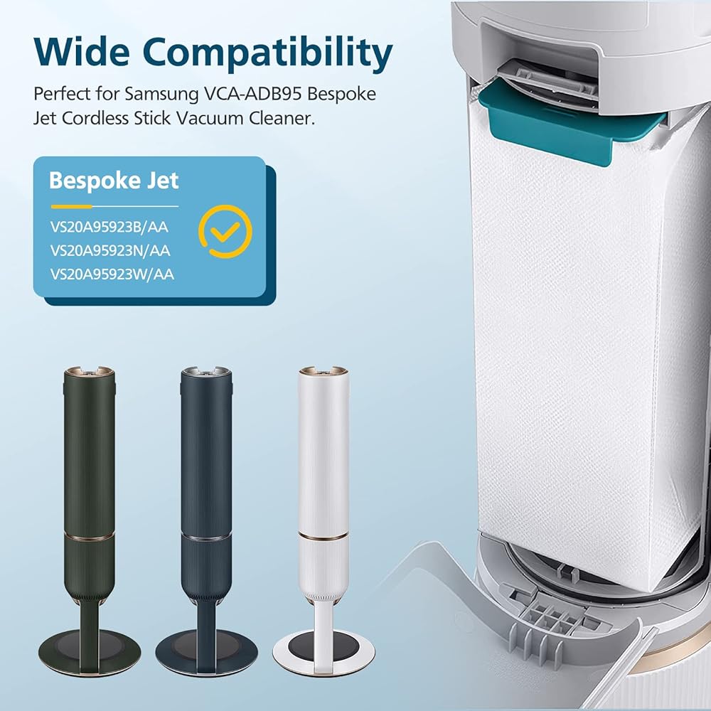 الملاءمة: أكياس استبدال صندوق الغبار VCA-ADB95 هذه متوافقة للاستخدام مع مكانس سامسونج BESPOKE Jet Stick اللاسلكية مع محطة تنظيف الكل في واحد - موديلات VS20A95923B/AA، VS20A95923N/AA، وVS20A95923W/AA، مقارنة بالجزء # VCA-ADB953/AA ، يرجى التحقق مرة أخرى من طراز المكنسة الكهربائية الخاصة بك قبل الشراء.