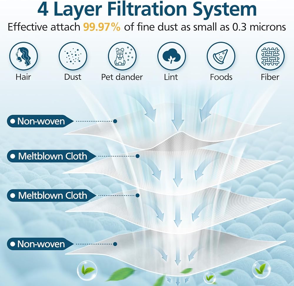 ترشيح فعال للغبار: أكياس المكنسة الكهربائية VCA-ADB95 هذه مصنوعة من نسيج مكون من 4 طبقات، من الخارج إلى الداخل وهي غير منسوجة ممتازة، ومنفوخة بالذوبان، ومنفوخة بالذوبان، ونسيج مغزول قوي بما يكفي للوقوف بشكل جيد، وليس من السهل طيها مقارنة بالمكنسة الكهربائية الأخرى ذات العلامات التجارية كما أن الحقيبة تحجب بشكل فعال أكثر من 99.97% من الجزيئات الكبيرة التي يصل حجمها إلى 0.3 ميكرون من المنزل.