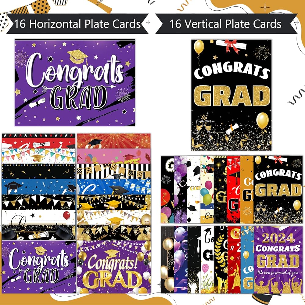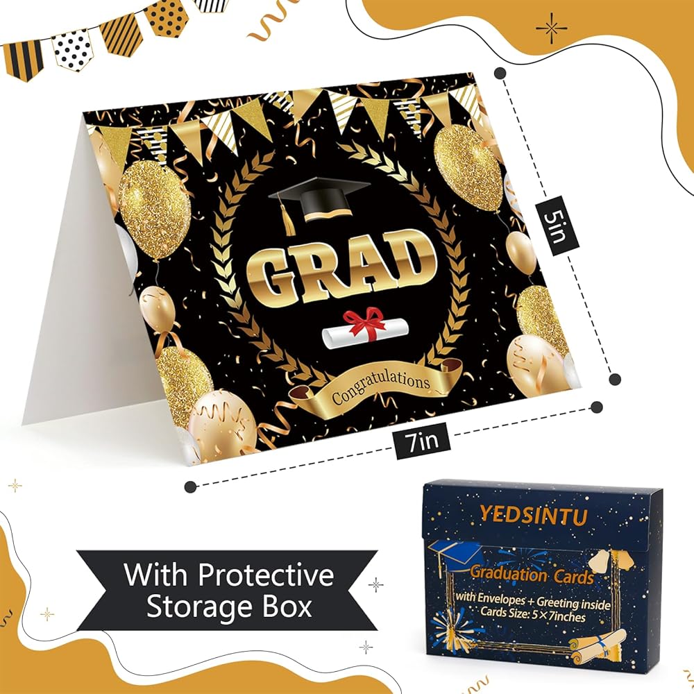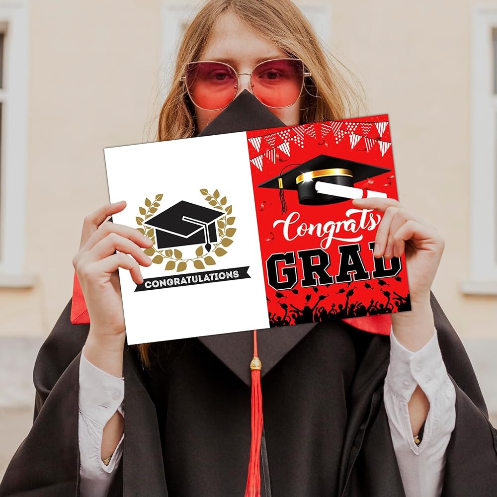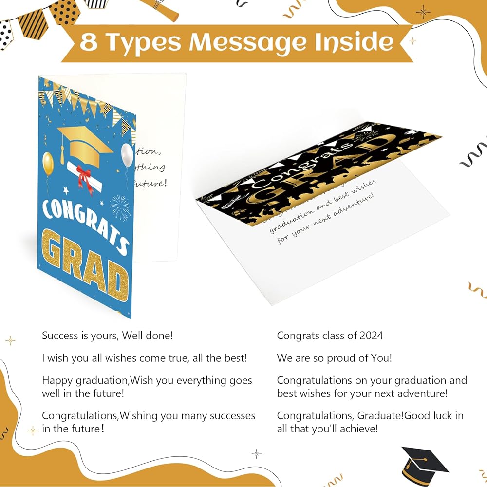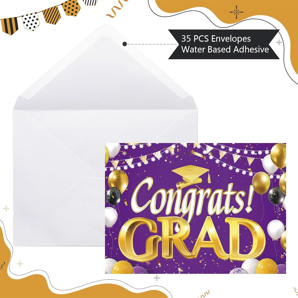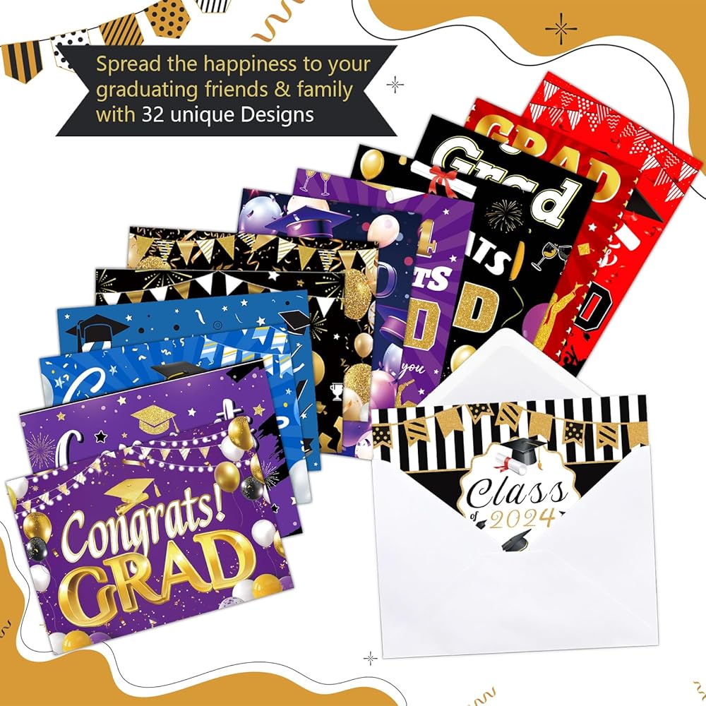 حزمة بطاقات التخرج: تحتوي بطاقة التخرج الـ 32 هذه على 32 تصميمًا فريدًا (16 بطاقة أفقية و16 بطاقة رأسية)، و35 ظرفًا أبيض مع إغلاق اللثة القابل للذوبان في الماء و36 ملصقًا للغلق. مثالي للمعلمين والآباء وزملاء الدراسة وأصدقاء الخريجين في المدرسة الثانوية والكلية والمزيد.
