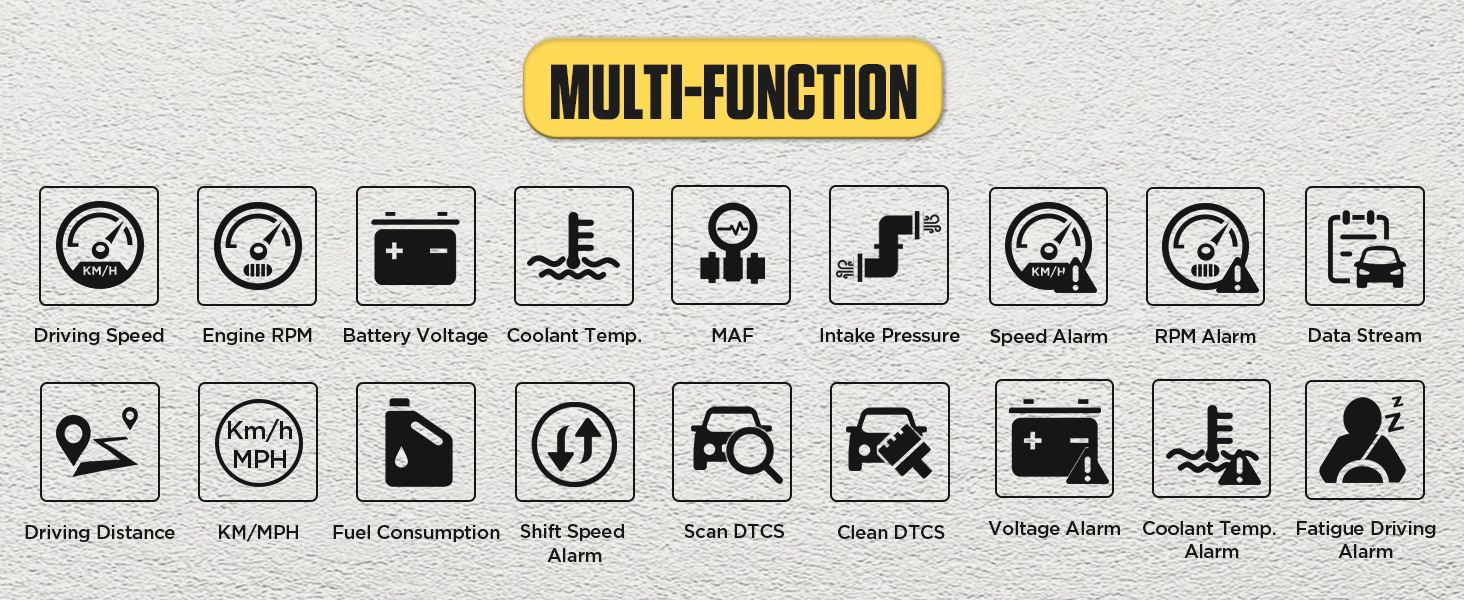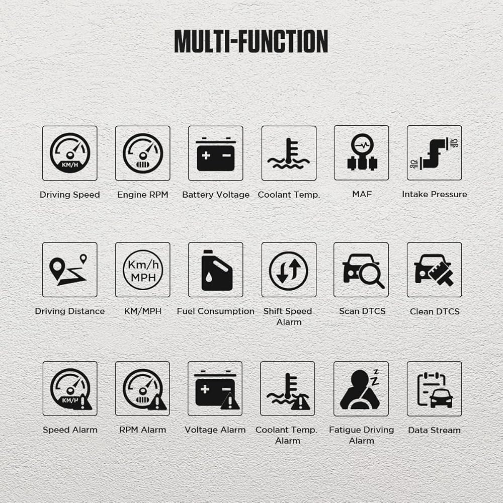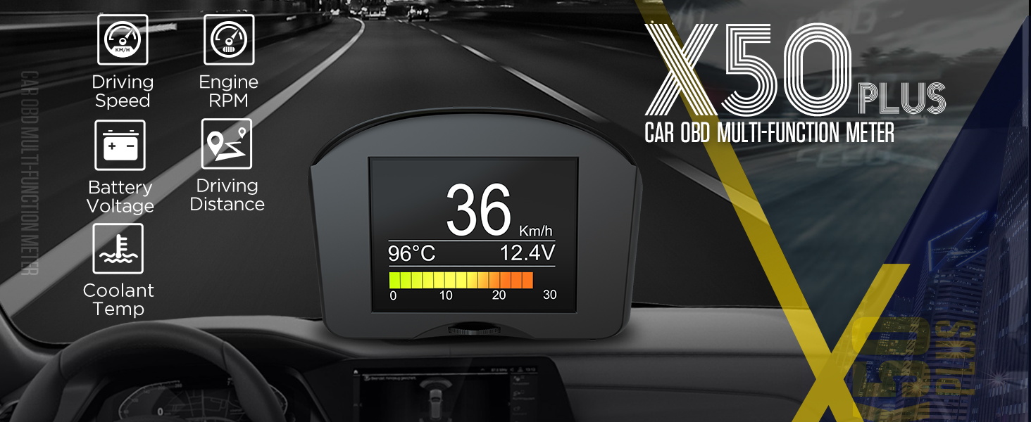 وظائف إنذار السلامة: جهاز X50 Plus Car Obd متعدد الوظائف يسمح بدعم إنذار مبكر لدرجة حرارة الماء، إنذار مبكر للسرعة الزائدة، تحويل تذكير إنذار مبكر وإنذار مبكر لخطأ السيارة.