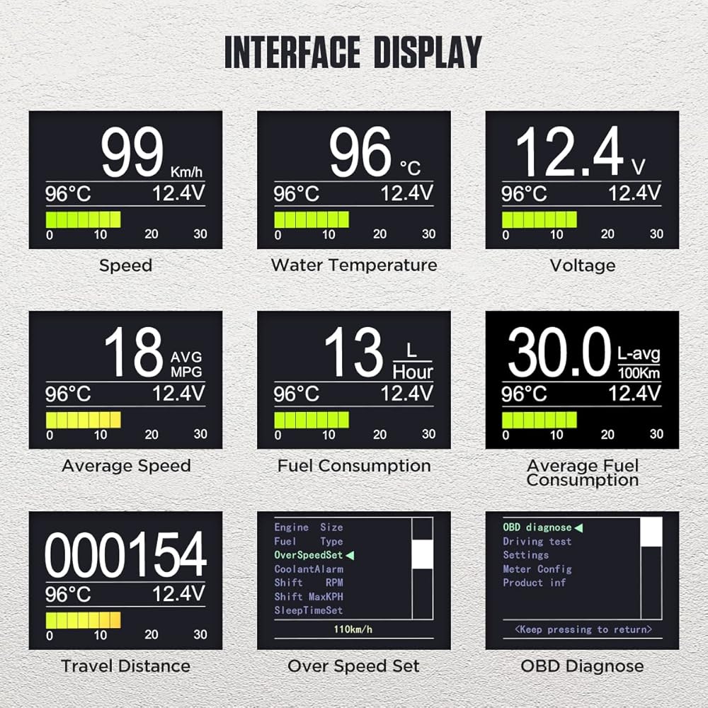 【شاشة متعددة الوظائف】عداد السيارة الرقمي الذكي OBD مع مجموعة متنوعة من أوضاع واجهة التشغيل، يمكن تشغيل شاشة LED بحرية، ودرجة حرارة سائل التبريد، واستهلاك الوقود ومراقبة سرعة المحرك وسرعة القيادة، وما إلى ذلك، مما سيجلب المزيد من المرح والتكنولوجيا شعور لك.
