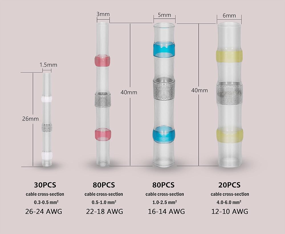 - أنابيب انكماش من البولي أوليفين مبطنة بمادة لاصقة شفافة، ويبقى اللون بعد التسخين والانكماش - مما يسمح بالفحص البصري للاتصال.