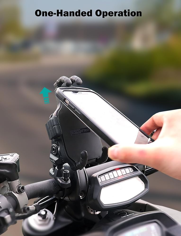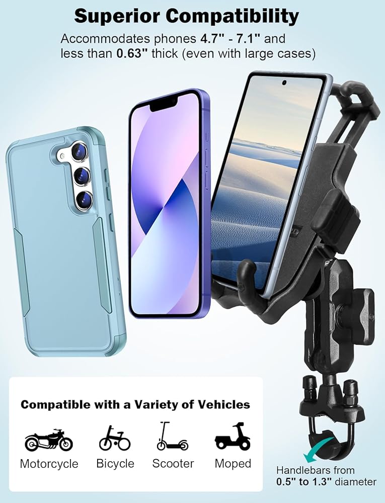 • توافق ممتاز - مقاسان من البراغي على شكل حرف U مناسبان لمعظم مقود الدراجات النارية. يناسب حامل الهاتف الخلوي للدراجة الهواتف المحمولة التي يتراوح سمكها من 4.7 بوصة إلى 7.1 بوصة حتى 0.63 بوصة (16 ملم). متوافق مع iPhone 14/ 13/ 12/ 11 Pro Max، Pro، iPhone 14 Plus، iPhone Xs، iPhone XR، X ، 8 بلس 7 6s 6، جالاكسي S23، S23+، S22، S21، S22، S10، نوت، إل جي والمزيد.