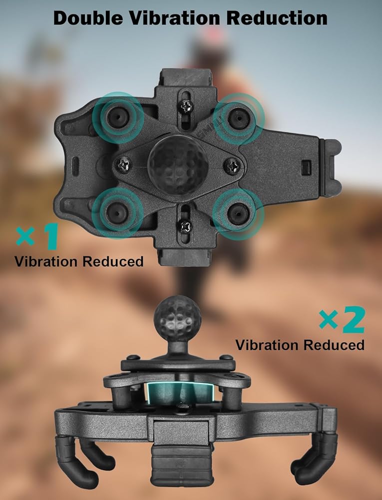 • تقليل الاهتزاز بنسبة 80% - مزود بـ "تعليق" لتركيب الهاتف، يمتص الاهتزاز المنقول من المقود إلى الهاتف، ويحمي الأجزاء الضعيفة، مثل العدسة (ليس للحفاظ على ثبات لقطة الهاتف).