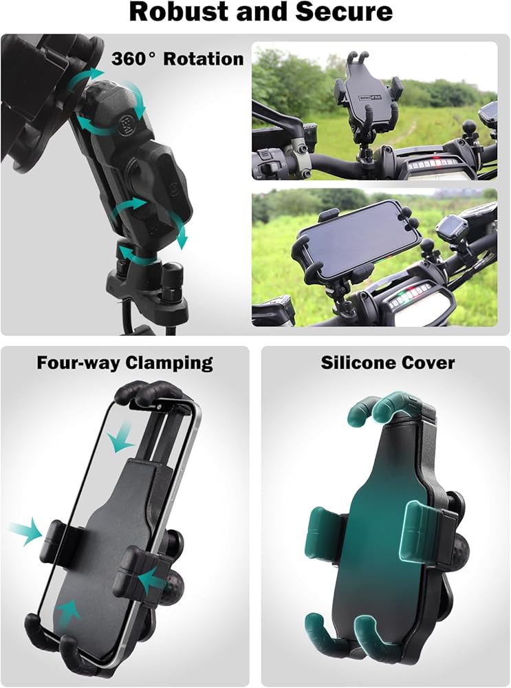• يحافظ على أمان جهازك - أمسك هاتفك بثبات في موضعه حتى على أصعب الطرق باستخدام القفل رباعي الاتجاهات. مغطى بالسيليكون الناعم، يمكنك وضع هاتفك مباشرة بدون حافظة. سطح الاتصال المبتكر على شكل قرص العسل يزيد من الإمساك بنسبة 90%.
