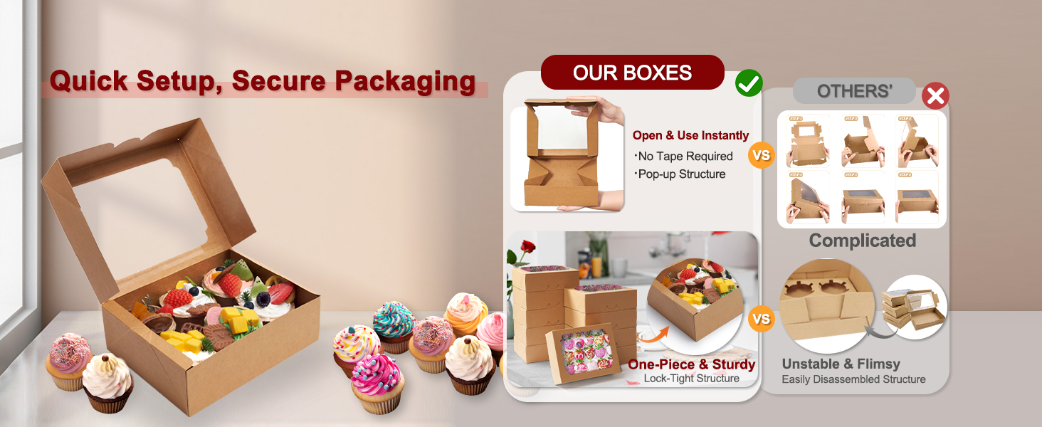 صناديق ملفات تعريف الارتباط الآمنة القابلة للفتح السريع والخالية من الأشرطة: هل أنت جاهز للتخلص من الصناديق الواهية التي يصعب تجميعها؟ يتم إعداد صناديق الحلوى الخاصة بنا لتقديم الهدايا في لمح البصر - دون الحاجة إلى شريط لاصق. استمتع باستقرار احترافي وتأمين سلعك المخبوزة بثقة. يضمن الفتح في ثانية واحدة أن تكون صناديق المخبوزات هذه ثابتة وتحافظ على شكلها دون أي ضجة.